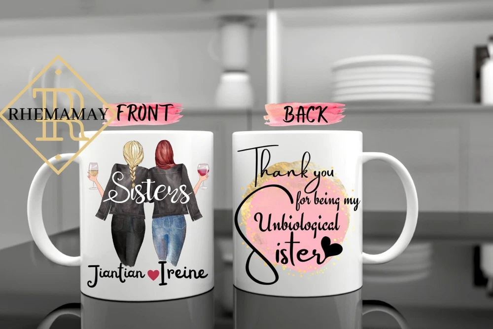 Thank You Mug For Being My Unbiological Sister Sisters Coffee Mug Custom Name Product Details.. This high quality 11oz. ceramic white mug has a premium hard coat that provides crisp and vibrant color reproduction sure to last for years. Perfect for all hot & cold beverages. The highest quality printing possible is used. It will never fade no matter how many times you wash it. Material: 100% Ceramic. Print both sides. Dishwasher and Microwave Safe. High Gloss + Premium White Finish. Printed in the U.S.A. Personalized & Custom. We support personalized and custom mug to add custom, when placing an order, you can add notes to the "order note" in shipping address section. Also you can contact us directly via message. Shipping Info. Ready to ship in 1 to 2 business days, All products are made-to-order and proudly printed in the United States. Shipped by USPS and DHL, You will receive your order in 5-7 days. Replace & Refund. All products are defective during shipping broken, chipped will be replaced free of charge. You are not satisfied with the product, we will refund 100% money to you. If any other issues arise, please do not hesitate to message, we would be more than happy to assist you.