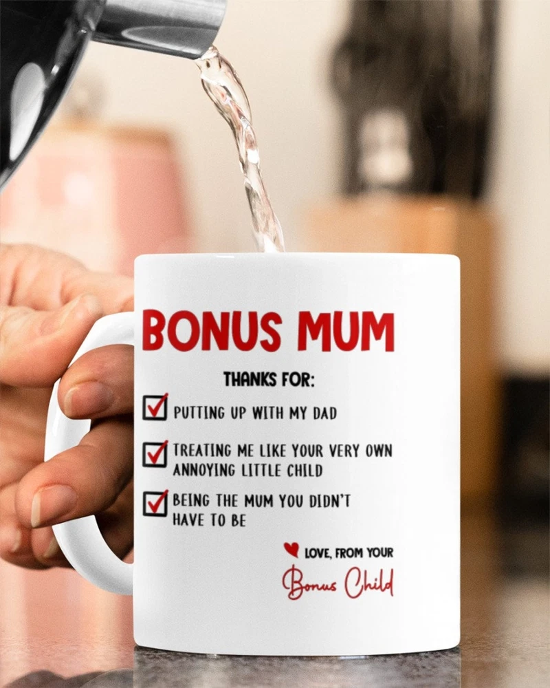 Thanks My Bonus Mom Personalized Coffee Coffee Mug Gift To Bonus Mom From Bonus Product Details.. This high quality 11oz. ceramic white mug has a premium hard coat that provides crisp and vibrant color reproduction sure to last for years. Perfect for all hot & cold beverages. The highest quality printing possible is used. It will never fade no matter how many times you wash it. Material: 100% Ceramic. Print both sides. Dishwasher and Microwave Safe. High Gloss + Premium White Finish. Printed in the U.S.A. Personalized & Custom. We support personalized and custom mug to add custom, when placing an order, you can add notes to the "order note" in shipping address section. Also you can contact us directly via message. Shipping Info. Ready to ship in 1 to 2 business days, All products are made-to-order and proudly printed in the United States. Shipped by USPS and DHL, You will receive your order in 5-7 days. Replace & Refund. All products are defective during shipping broken, chipped will be replaced free of charge. You are not satisfied with the product, we will refund 100% money to you. If any other issues arise, please do not hesitate to message, we would be more than happy to assist you.