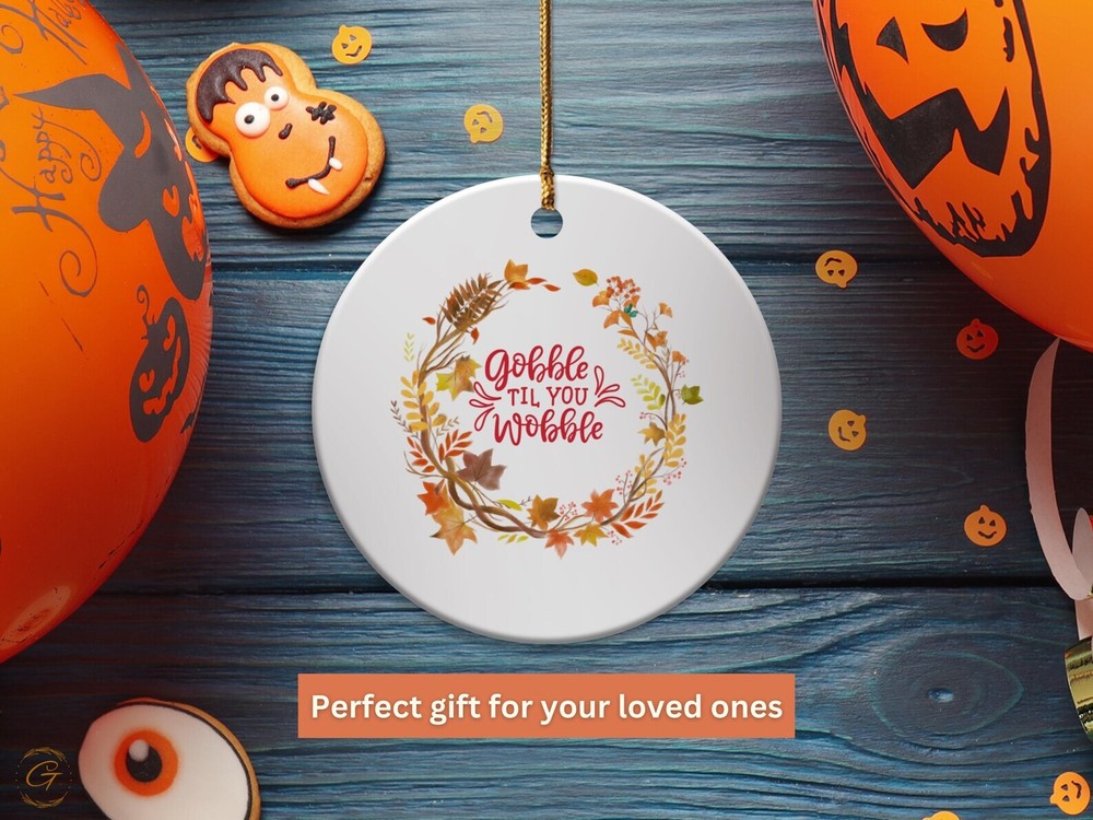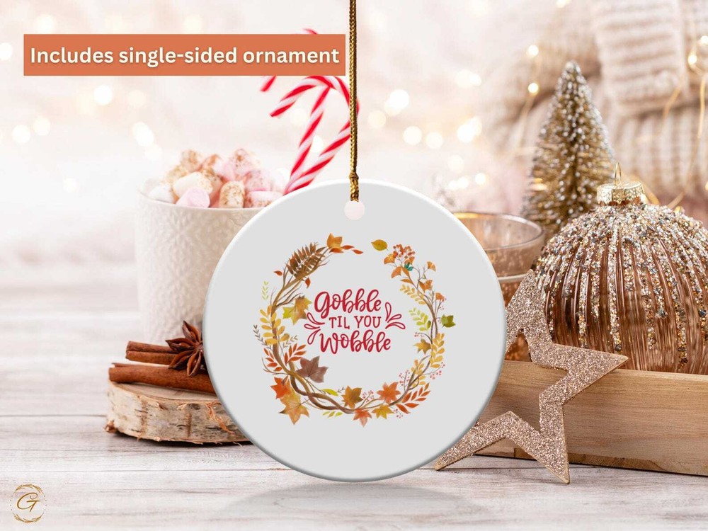 Fall Wreath Ornament Gobble Til You Wobble Thanksgiving Autumn Leaves Harvest Season Decoration Festive Home Ornament Thanksgiving Gift Material: Ceramic Color: White Shapes: Circle, star, heart and oval Can be printed on both sides Imprint full-color artwork, photos, or logos Hole for hanging string and hanging string included Printed in the USA