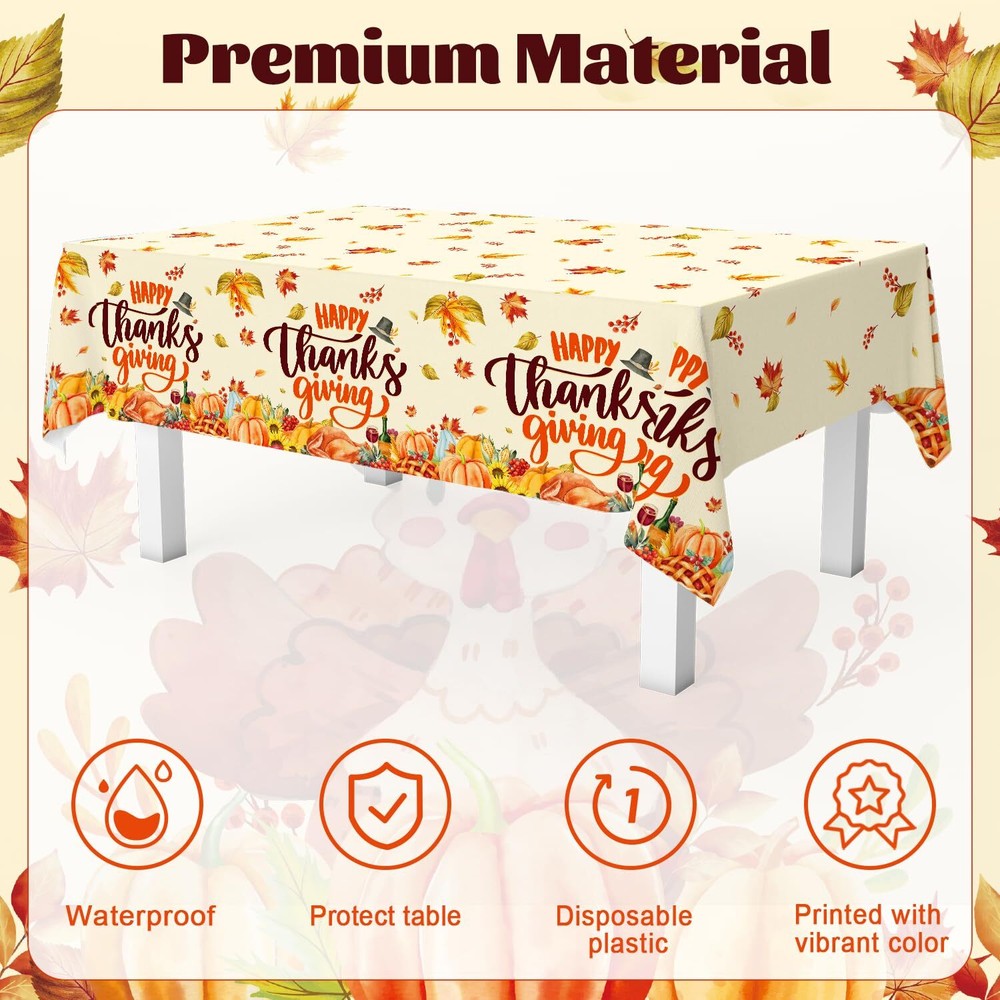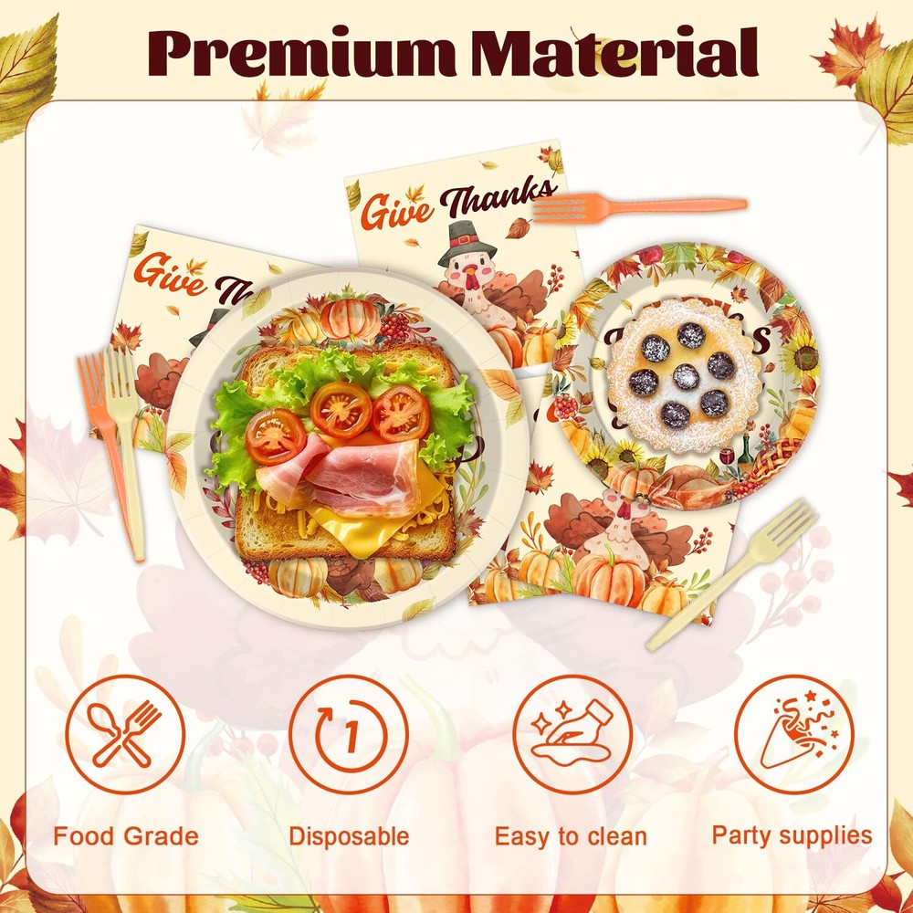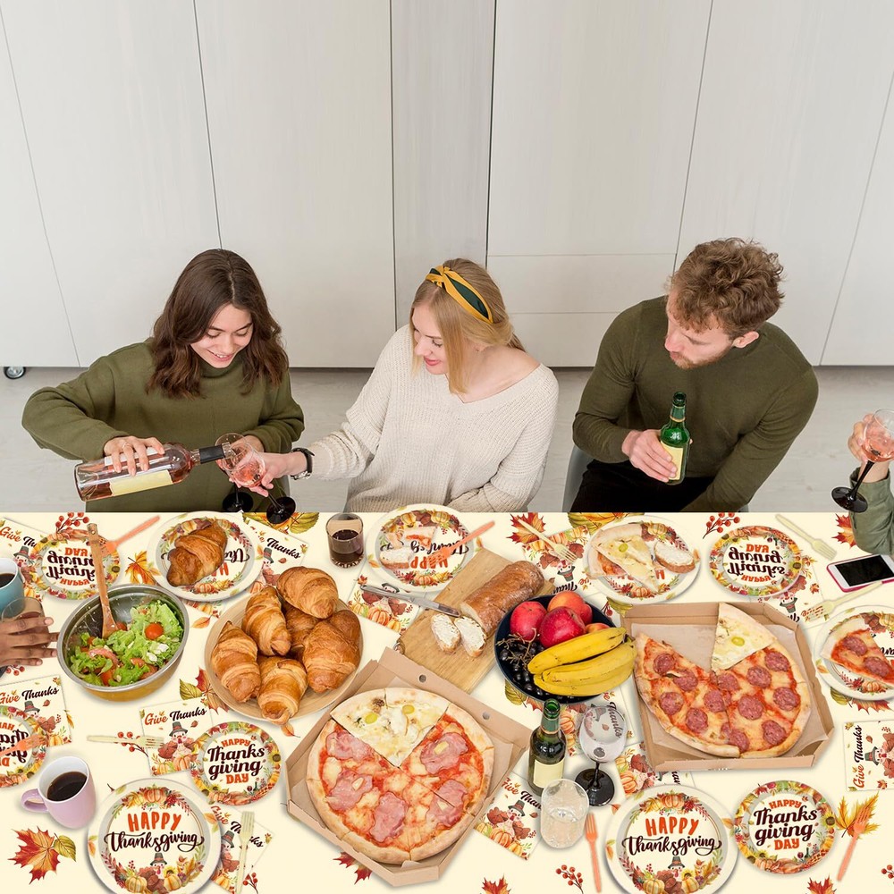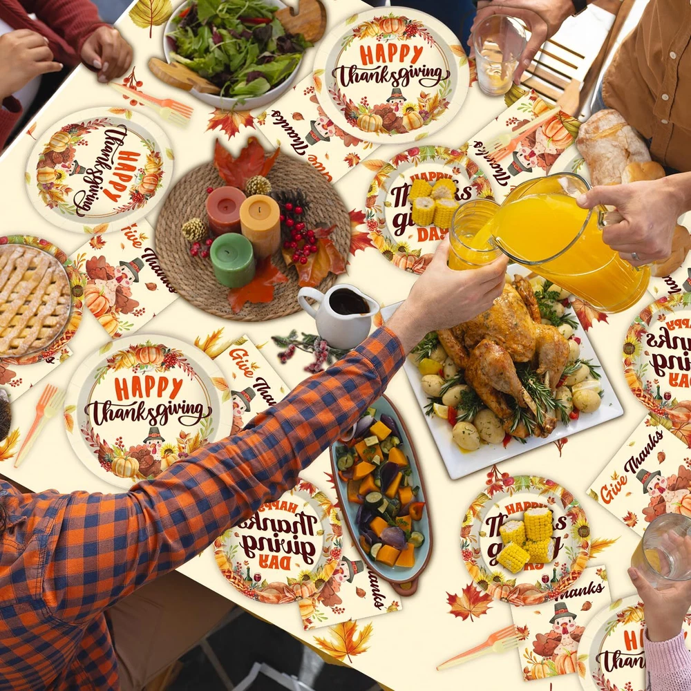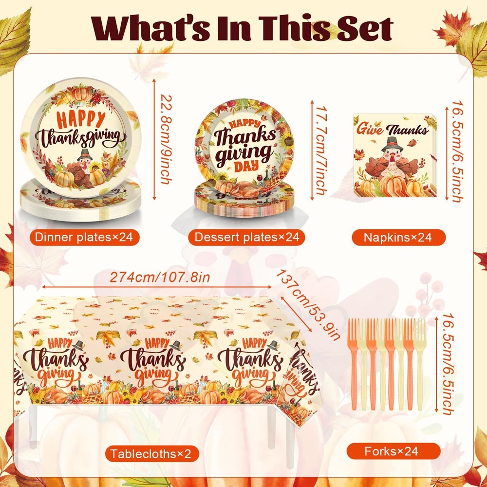 Make Your Thanksgiving Extra Special with This Plates and Napkins Set The Happy Thanksgiving disposable dinnerware set adds the perfect touch to your party, seamlessly complementing other autumn decorations to make your celebration truly unique. Set Includes: 2 pcs 54*108 inch tablecloths 24 pcs 9-inch disposable dinner plates 24 pcs 7-inch paper dessert plates 24 pcs napkins featuring classic Thanksgiving designs 24 pcs forks (2 colors) Features: -Convenient and Disposable: No need to worry about washing up! Made from high-quality cardboard, this tableware is safe, odorless, and durable, protecting your table from scratches and spills. Enjoy every moment of the party with confidence. -Classic Thanksgiving Design: Featuring traditional autumn elements like turkeys, pumpkins, and maple leaves, this set pairs perfectly with other Thanksgiving decorations such as Happy Thanksgiving banners, creating a warm and festive atmosphere that will make your event truly memorable. Bring this stylish and fun Thanksgiving dinnerware set to your party and create lasting memories with family, kids, and friends. Comprehensive Set: The Thanksgiving tableware set includes 24 9-inch disposable dinner plates, 24 7-inch dessert plates, 24 colorful plastic forks, 24 printed napkins, and 2 tablecloths, providing everything you need to serve 24 guests at once. Disposable Convenience: The Thanksgiving dinnerware set offers an easy and hassle-free party experience. Forget about cleaning up—simply toss everything out after use, giving you more time to enjoy quality moments with your kids, family, and friends. Quality Materials: The Thanksgiving dinner plates are crafted from premium quality, thickened cardboard, making them durable and heat-resistant. This ensures a convenient and safe dining experience, allowing you to fully enjoy your party. Stylish and Durable: Featuring classic Thanksgiving elements like turkeys, pumpkins, and maple leaves, the Thanksgiving plates napkins, and tablecloth set is printed with bright, fade-resistant colors, adding joy and lasting memories to your celebrations. Perfectly Coordinated: Thanksgiving party supplies pair beautifully with other fall decorations, to create a warm atmosphere. It’s ideal for any Thanksgiving event, whether it’s a kids’ Thanksgiving party, a family gathering, or a Friendsgiving party.