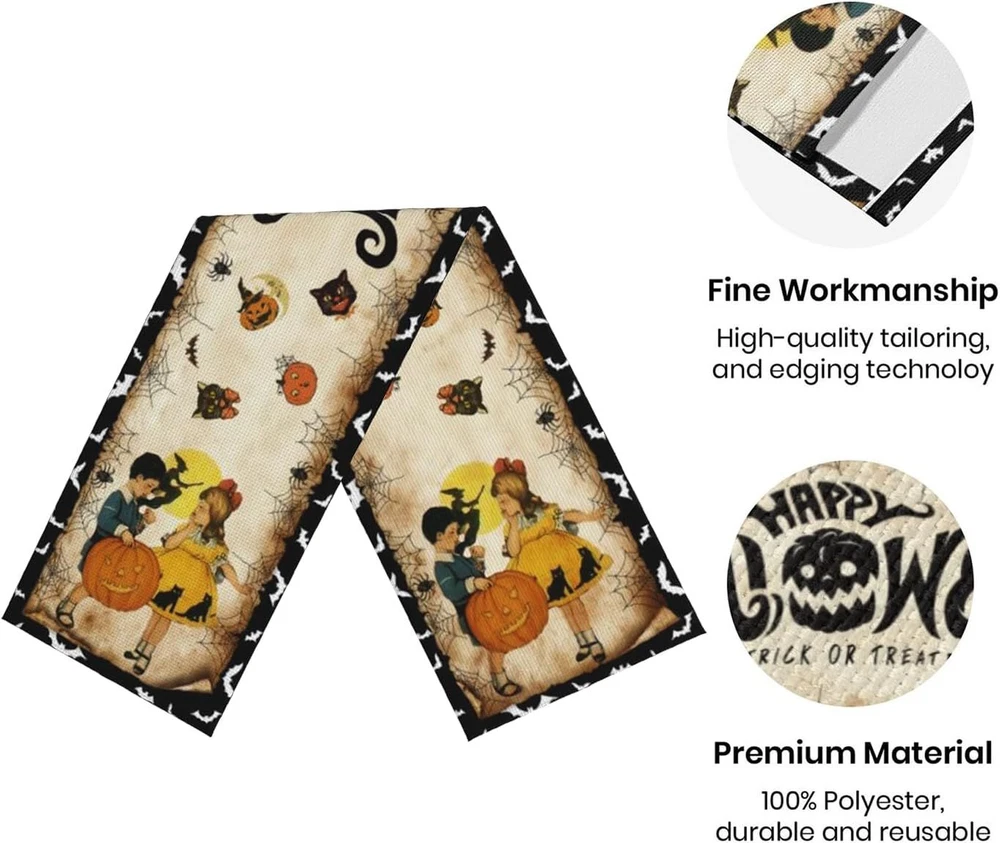 Vintage Halloween Table Runner Decorations - Black Product Details Product Dimensions: 72"L x 12"W Manufacturer: Racenaf Item Weight: 3.84 ounces Country of Origin: China Item model number: 01 Fabric Type: 100%linen Batteries required: No Included Components: Table Runner Color: Black Material: Linen Brand: Racenaf Pattern: Halloween Product Care Instructions: Machine Wash, Hand Wash, Line Dry, Do Not Bleach 100%linen VINTAGE HALLOWEEN TABLE RUNNER PACKAGE INCLUEDE: You will receive 13" x 72" (33*183 cm) vintage Halloween table runner. The retro Halloween table runner is very suitable as a Halloween decoration, make your cabin more Halloween atmosphere. UNIQUE DESIGN: The designs of this retro Halloween table runner are carefully selected, Use unique boy, girl, witch, pumpkin, other cute vintage Halloween elements and printed with black "HAPPY HALLOWEEN", "TRICK or TREAT" with vintage Halloween style theme. while also achieving an unparalleled visual effect can add a warm festive atmosphere to your family or party. HIGH QUALITY MATERIAL: Our Halloween table runner are made of premium linen, sturdy sewing, soft and durable, protecting your table's surface from hot pans, scratches, and spills. Machine washable or hand wash clean recommended on a cold water, hang to dry, don't bleach. APPLICABLE SCENE: This vintage Halloween table runner is perfect for rectangle table decorative perfect for can be used for your Halloween day theme party, holiday party, kitchen dining daily use, family gathering, indoor or outdoor decoration for Halloween holidays, special events celebration and more. Add to your Halloween atmosphere. PERFECT SERVICE: In celebrating the Halloween, customer satisfaction is our first purpose, If you have any questions about this Halloween table runner, please contact us, we will definitely give you a satisfactory answer within 12 hours. Sincerely wish you a Happy Halloween. Halloween Table Runner