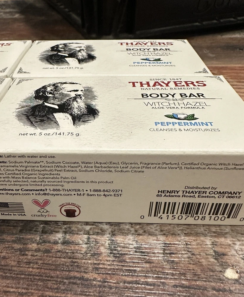 Type:Bath and Body / Bar SoapProduct:Bath and Body / Bar SoapFeatures:Animal Cruelty-FreeUPC:041507081000Item Weight:5 ozBody Area:Bodygtin13:041507081000Ingredients:Aloe Vera, Peppermint, Witch HazelScent:PeppermintBrand:Thayers