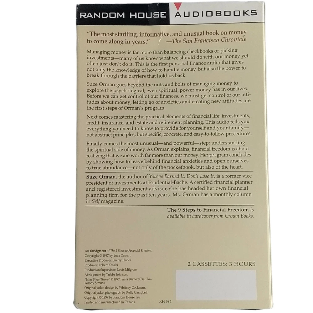 Book Title:The 9 Steps To Financial FreedomNarrative Type:NonfictionCountry/Region of Manufacture:CanadaIntended Audience:Young Adults, AdultsTopic:Personal FinanceLanguage:EnglishNarrator:Suze OrmanType:AudiobookFormat:CassetteGenre:EconomicsCase Type:Cardboard SleevePublication Year:1997Run Time:3hrsAuthor:Suze OrmanFeatures:Abridgedgtin13:Does not applyPublisher:Random HouseISBN:Does not apply
