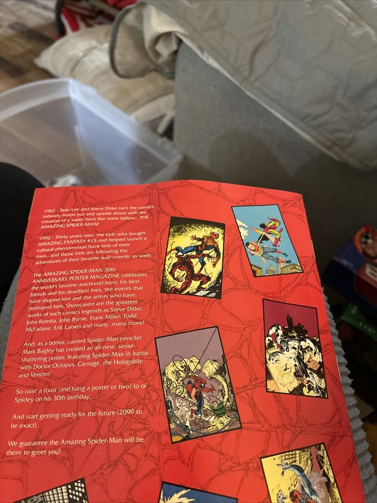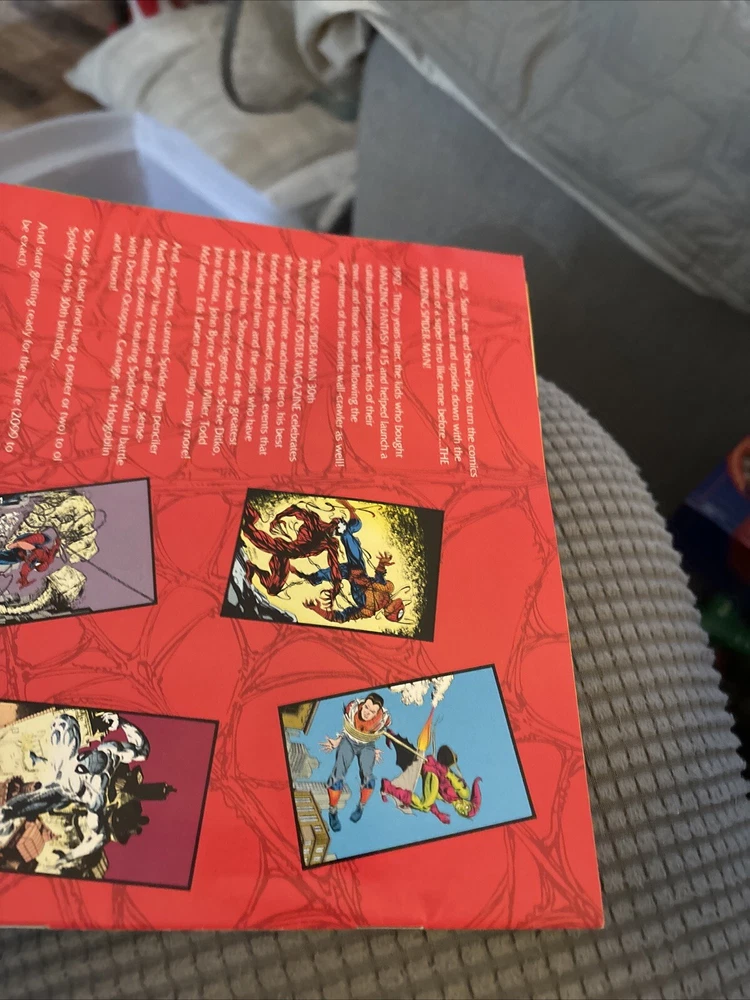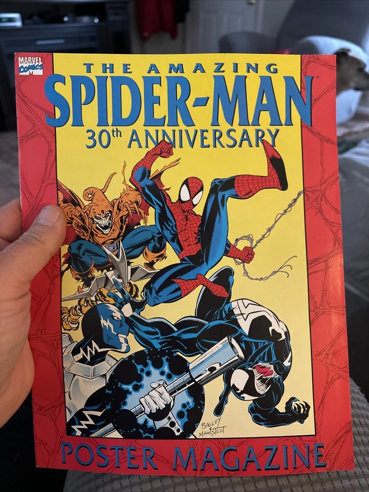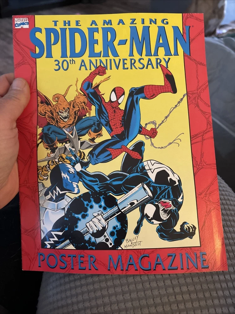 Celebrate the 30th anniversary of Amazing Spider-Man with this iconic poster magazine. Featuring Venom as the main character, this collector's edition comic book is a must-have for any Marvel (MCU) fan. The publication year is 1992, and the comic book is in album format with English language. The comic book posters are all 9.4 near mint, and it comes with 26 posters. The artist/writers include Steve Ditko, Stan Lee, Todd McFarlane, John Byrne, Frank Miller, and John Romita Sr. The cover art is done by Mark Bagley and many other famous artists, and the comic book is signed by no one. The intended audience is a general audience, and it belongs to the US Comics tradition. This vintage comic book is published by Marvel Comics, and it belongs to the Superheroes genre. - Beautiful copies, see pictures - Includes images of AMAZING FANTASY 15 AMAZING SPIDER-MAN 39 AMAZING SPIDER-MAN 50 AMAZING SPIDERMAN 129 AMAZING SPIDER-MAN 361 AMAZING SPIDER-MAN ANNUAL 16 SPECTACULAR SPIDER-MAN 101 And many others!! - Shipped with the utmost care to insure no damage during shipping - Usps ground Advantage Check out our 1000s of comics in our store We combine shipping