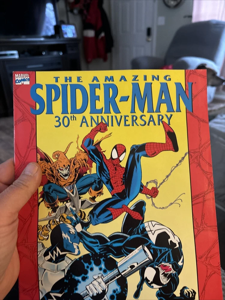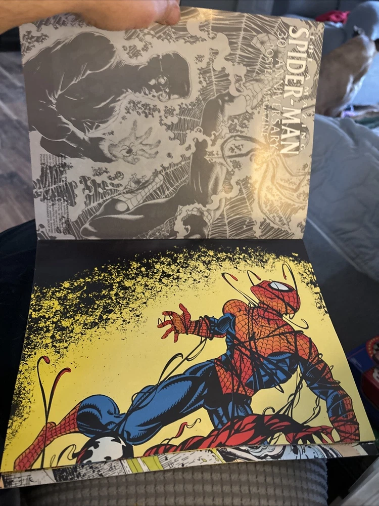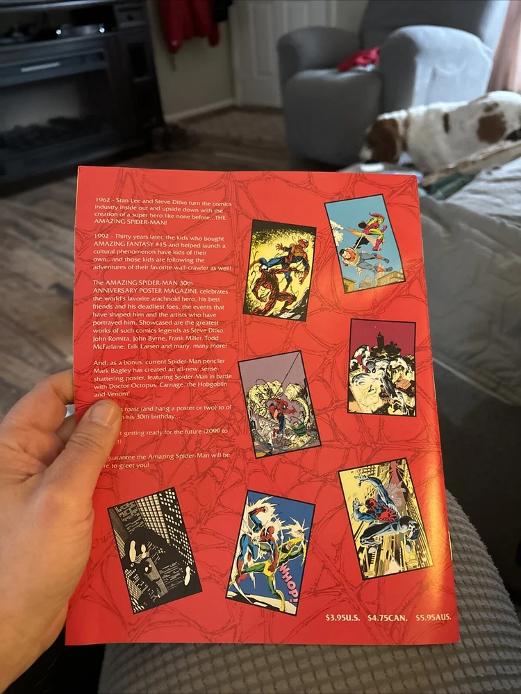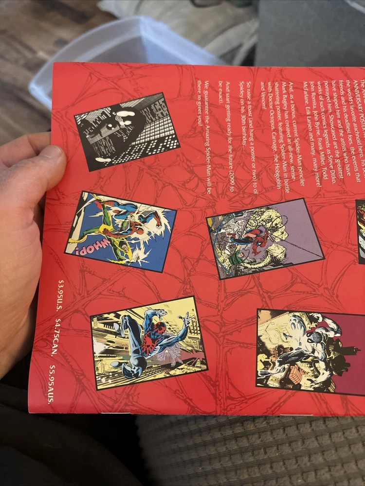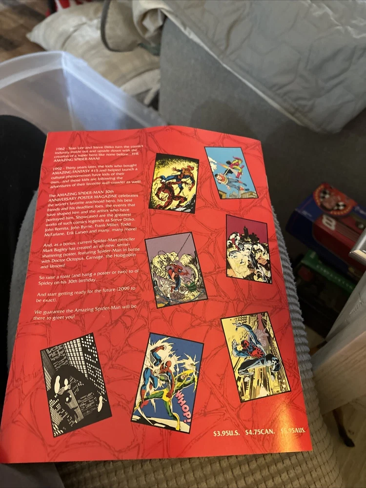 Celebrate the 30th anniversary of Amazing Spider-Man with this iconic poster magazine. Featuring Venom as the main character, this collector's edition comic book is a must-have for any Marvel (MCU) fan. The publication year is 1992, and the comic book is in album format with English language. The comic book posters are all 9.4 near mint, and it comes with 26 posters. The artist/writers include Steve Ditko, Stan Lee, Todd McFarlane, John Byrne, Frank Miller, and John Romita Sr. The cover art is done by Mark Bagley and many other famous artists, and the comic book is signed by no one. The intended audience is a general audience, and it belongs to the US Comics tradition. This vintage comic book is published by Marvel Comics, and it belongs to the Superheroes genre. - Beautiful copies, see pictures - Includes images of AMAZING FANTASY 15 AMAZING SPIDER-MAN 39 AMAZING SPIDER-MAN 50 AMAZING SPIDERMAN 129 AMAZING SPIDER-MAN 361 AMAZING SPIDER-MAN ANNUAL 16 SPECTACULAR SPIDER-MAN 101 And many others!! - Shipped with the utmost care to insure no damage during shipping - Usps ground Advantage Check out our 1000s of comics in our store We combine shipping