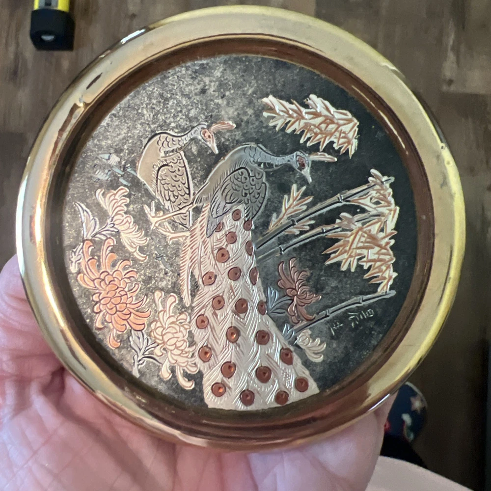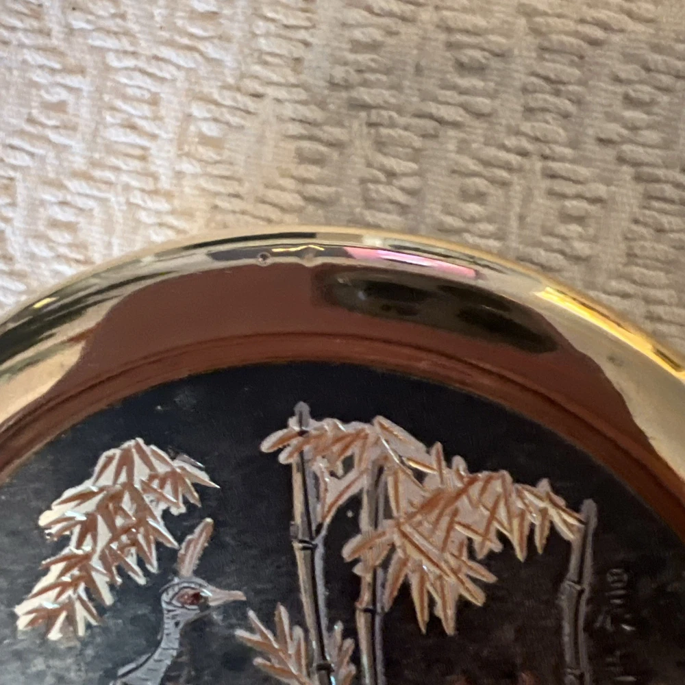 Experience the elegance of Asian artistry with this exquisite The Art of Chokin trinket box. Adorned with a stunning peacock motif, this porcelain dish is meticulously crafted in Japan, featuring a rich gold finish that exudes a timeless charm. The circular shape and 24 KT gold trim enhance its beauty, making it a sophisticated addition to any collection. This piece not only serves as a functional trinket box but also as a decorative accent that reflects a sense of luxury and tradition. Whether for personal use or as a thoughtful gift, it brings a touch of vintage flair and cultural richness to any setting.