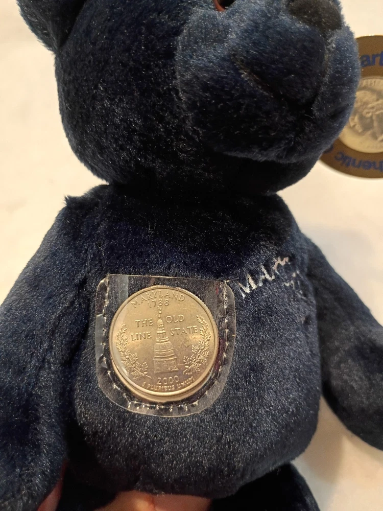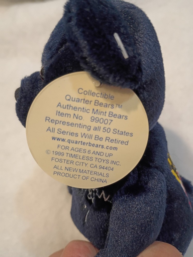 Comes with clear beanie case. The Authentic Collectible Quarter Bears - Virginia (10) 1999 are small stuffed animals measuring between 6-14 inches in size. Produced by Limited Treasures and imported from China in 1999, these teddy bears are part of a collection featuring different states. Recommended for ages 6 and up, these unique plush toys are perfect for collectors or as gifts for kids who love bears and states.