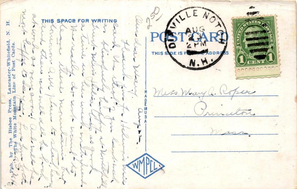 MAKE AN OFFER. THE MORE YOU BUY THE BETTER DEAL I WILL ACCEPT The postcard is from The Balsams and Lake Gloriette in Dixville Notch, New Hampshire. The message is addressed to Miss Mary A. Roper in Princeton, Massachusetts. The sender thanks Mary for a service or favor and mentions being blissfully happy at a recent event. The sender also talks about meeting again soon and getting back to work.