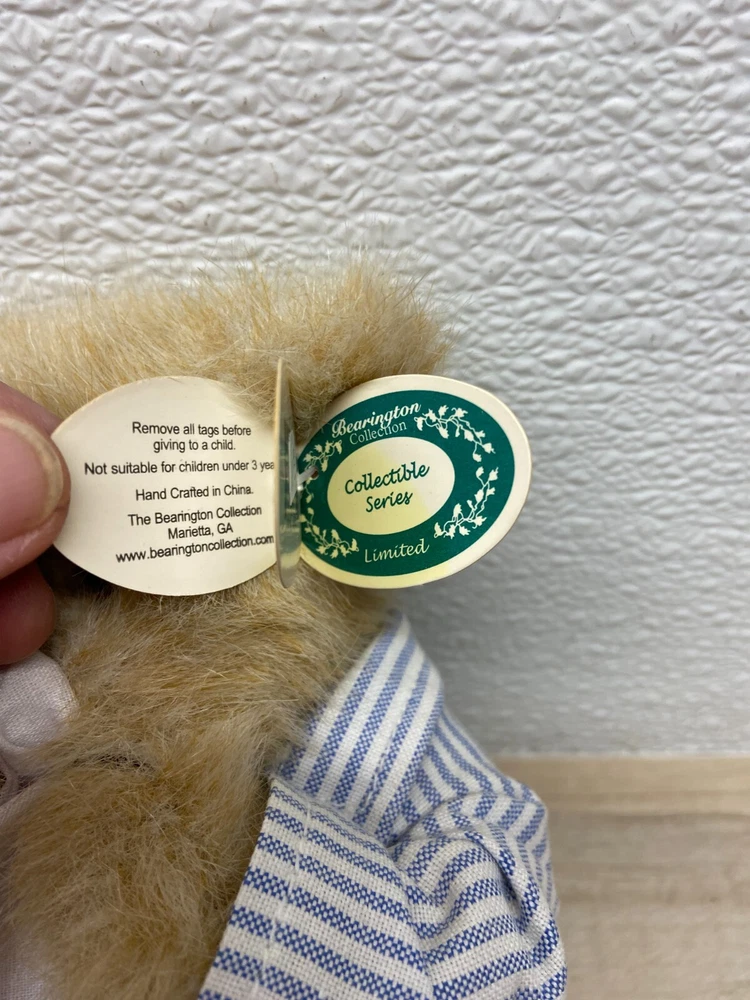 Collection: Bearington Collection Character: N/A gtin13: N/A Franchise: Bearington Size: 10 in Material: Plush Animal Species: Bear Original/Licensed Reproduction: Original Brand: Bearington Vintage: No Unit of Sale: Single Unit Eye Color: Black Type: Plush Bear Items Included: Clothing UPC: N/A Time Period Manufactured: 2000-2009 Antique: No Bear Color: Beige