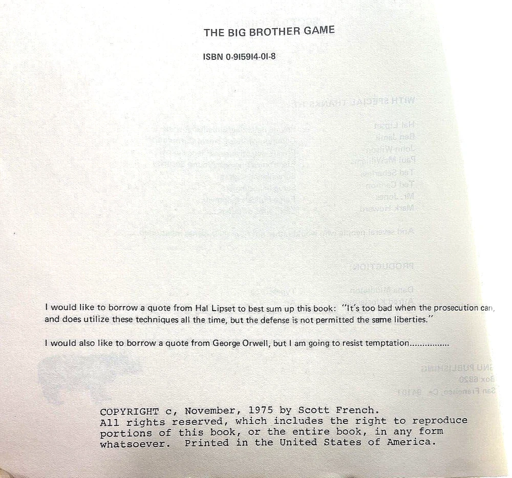 This trade paperback from titled The Big Brother Game by Scott French is a vintage first edition first printing publication. It contains 240 pages and covers topics related to privacy, intelligence, and espionage. The book is written in English and published by GNU Publishing in the United States.It is a must-read for those interested in law and political science genres. This book is in fair condition with wrinkles, staining and minor tears on the cover. There is also some staining on the last page. (see pics) Pages are in good shape with no marks or writing. Thank you