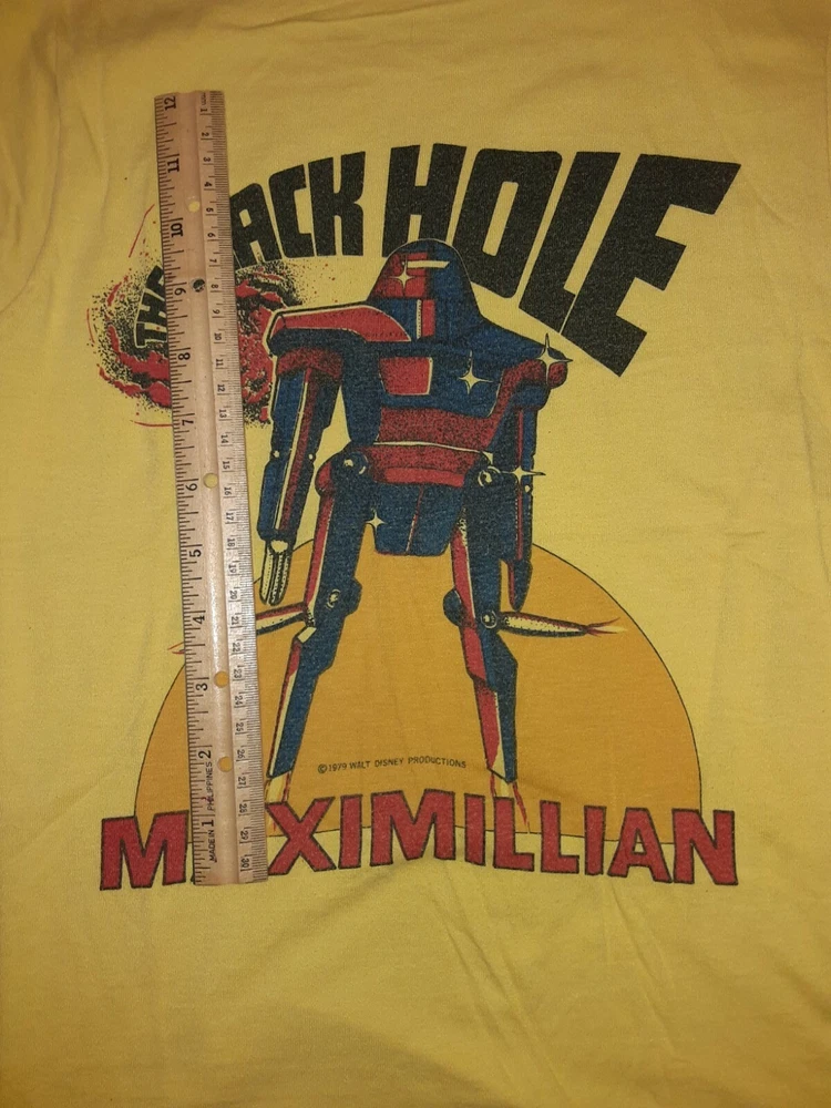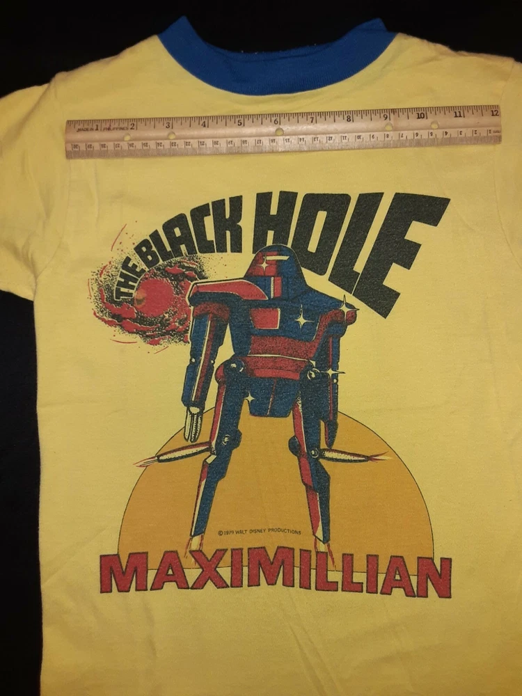The Black Hole MAXIMILLIAN Children's T-Shirt. 1979. Walt Disney Productions. RARE. Measures approx. 12" from one shoulder seam to the other. Size tag has faded. Shirt is in very good condition with bright colors and no rips, tears, holes, etc.. Amazin'! High bidder pays s&h. Thanks!