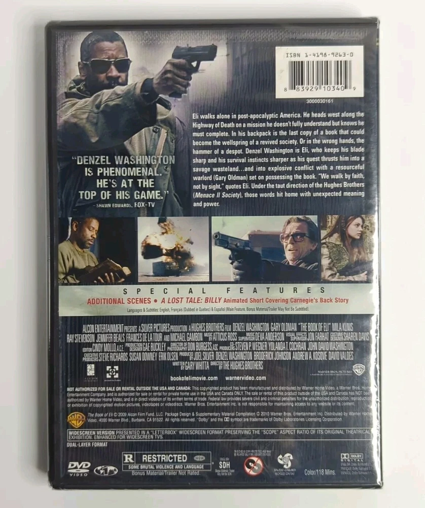 Immerse yourself in the post-apocalyptic world of "The Book of Eli" on DVD. Starring Denzel Washington, this action-packed adventure film is rated R and has a runtime of 118 minutes. The DVD edition year is 2014 and it is in the DVD Widescreen format with a Region Code of 1. This science fiction film is directed by Albert Hughes and Allen Hughes and produced by a talented team including Denzel Washington, Andrew Kosove, Broderick Johnson, David Valdes, Erik Olsen, Joel Silver, and Susan Downey. The movie has English, French, and Spanish language options with subtitles in the same languages. The Book of Eli" is a must-watch for fans of the genre and is a great addition to any movie collection.