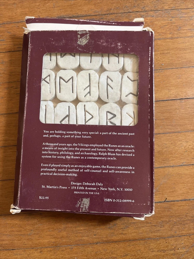 Ex Libris:Nogtin13:9780312089993Intended Audience:AdultsOriginal Language:EnglishPublisher:St. Martin's PressGenre:FantasyEra:1980sAuthor:Ralph H. BlumFeatures:IllustratedInscribed:NoPersonalize:NoItem Width:5.25 in.Vintage:YesTopic:BooksPublication Year:1984Book Title:Book of Runes : a Handbook for the Use of an Ancient Oracle: the Viking RunesLanguage:EnglishISBN:9780312089993Format:HardcoverCountry/Region of Manufacture:United StatesItem Length:7.5 in.Item Weight:19 oz.Personalized:NoSigned:NoNumber of Pages:127Edition:Second