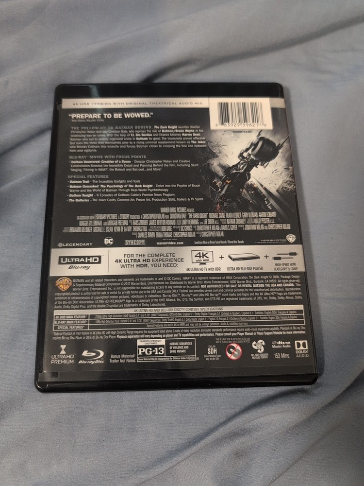 Genre:Action & AdventureStudio:Warner Home VideoMovie/TV Title:The Dark KnightRelease Year:2008Producer:Charles Roven, Christopher Nolan, Emma ThomasType:MovieFormat:Ultra HDDirector:Christopher Nolangtin13:0883929596218Features:WidescreenRating:PG-13UPC:0883929596218