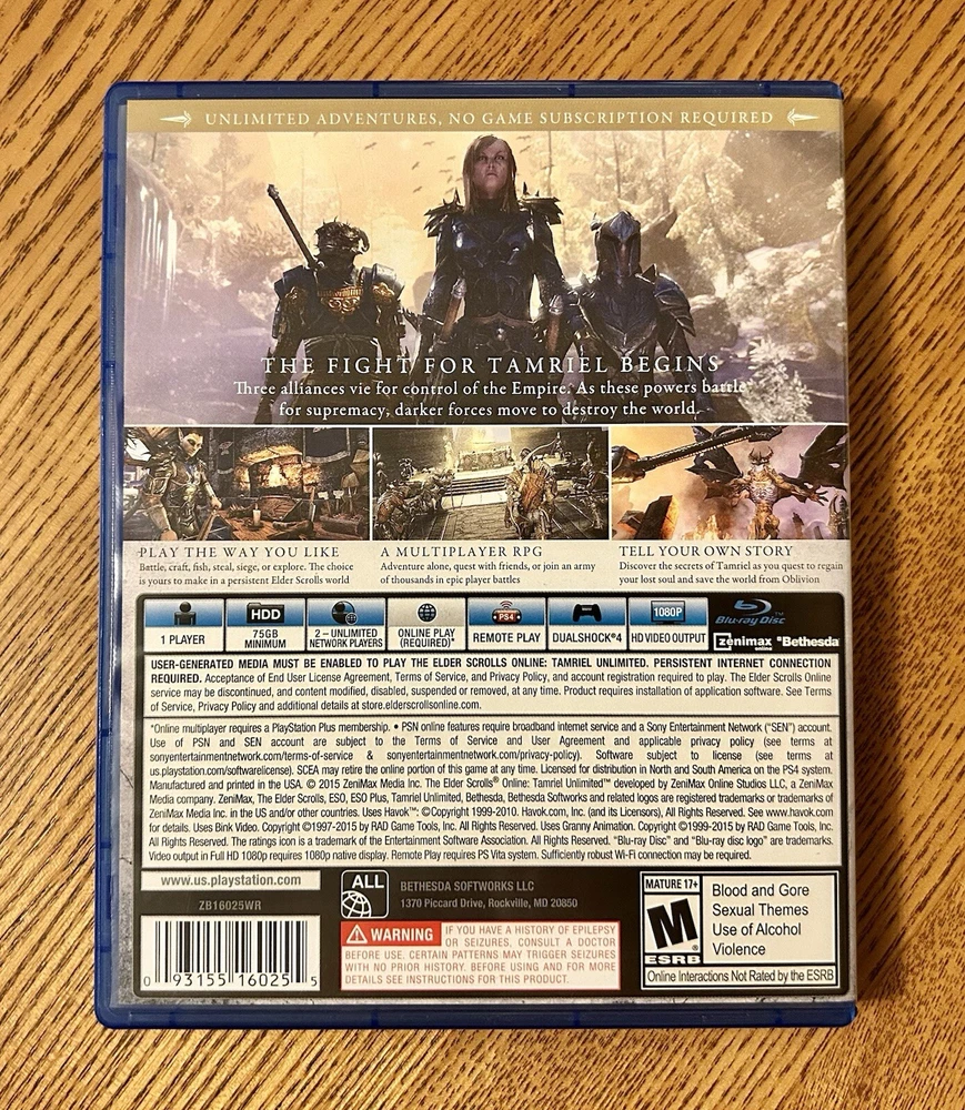 Immerse yourself in an epic adventure with The Elder Scrolls Online: Tamriel Unlimited for PlayStation 4. This role-playing game is rated M for mature audiences. Explore the vast open world of Tamriel, a region-free zone, and experience the thrill of online playability with the explorers pack DLC **Please Note: DLC Code is included, not sure if it can be redeemed multiple times, it’s a used game so I’m guessing the code has been used at least once, so no guarantees on the dlc. The game, published by Bethesda, comes with a manual and is perfect for those seeking a thrilling gaming experience. The unit type is a single unit, and the game was manufactured in the United States in 2015. Get ready to embark on an unforgettable journey with this custom bundle that includes no additional items.