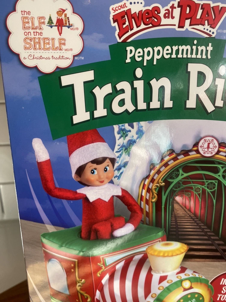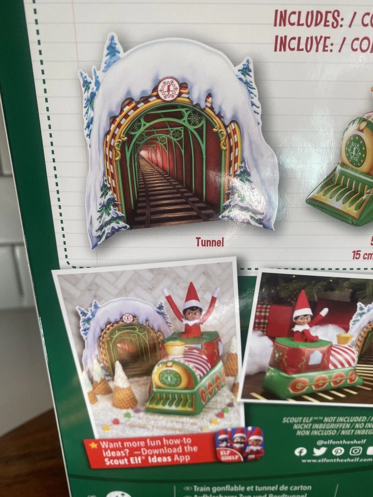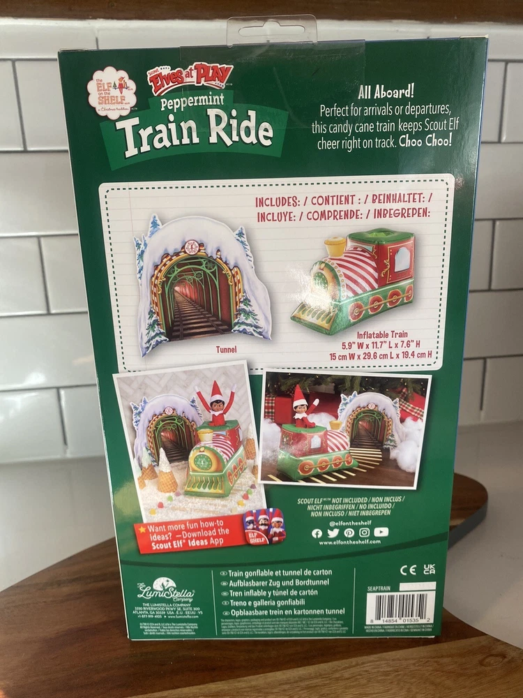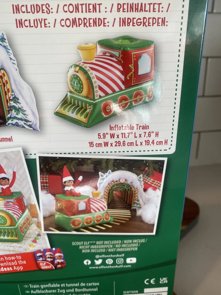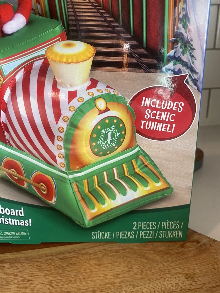 All aboard! Let your Scout Elf take a ride on the train this holiday! This set includes an inflatable peppermint train and a standing paperboard tunnel! Time to chug-a-lug into hours of play time! Perfect for Scout arrivals or departures, this candy cane train keeps Scout Elf cheer right on track. Choo Choo! Includes inflatable train and tunnel. Scout elf not included Recommended for ages 3+. WARNING: CHOKING HAZARD -- Small parts. Not for children under 3 years. Size: Train is 5.9" x 11.7" x 7.6".