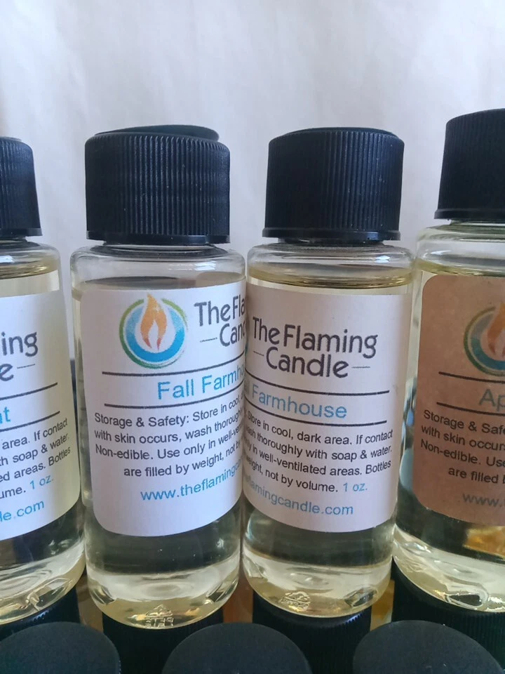 Create your own unique scented candles with The Flaming Candle's Fragrance Oil. With a variety of scents to choose from, this 1 fl oz bottle is perfect for candle making enthusiasts. Made in the United States, this high-quality fragrance oil is sure to enhance the aroma of your candles and create a more enjoyable burning experience. With a versatile range of scents, this fragrance oil is perfect for any occasion and will make your candles stand out from the rest. Whether you're a beginner or an experienced candle maker, The Flaming Candle's Fragrance Oil is a must-have for anyone looking to take their candle making to the next level. Scents include: Smores, Autumn Brunch, Vanilla Pumpkin Marshmallow, Gingerbread, Apple Cider Donut, Fall Farmhouse, Alpine Cheer, Autumn Night, Tropical Plumeria, Banana Brulee, Pumpkin Apple Butter, Cinnamon Spiced Vanilla, North Pole, Key Lime Pie, Banana Nut Bread, Vanilla Pumpkin Pie, Sweet Pea, Asian Sandalwood, Amethyst Aura, Summer Scoop, Pink Quartz, Lavender Sandalwood, Sandalwood & Suede, Pumpkin Spice Latte, Tis the Season, Pineapple Wild Mango, Vanilla, Lemon Lavender, Birthday Cake, Warm Leather & Spice, Endless Weekend, Be Enchanted, Sugar & Spice, Southern Iced Tea, Blueberry Cobbler, Georgia Peach, Pink Sugar, Peach Magnolia, Wild Berry Cheesecake, Salted Caramel Milkshake, Black Amber & Lavender, Volcano, Sundrenched Blossom, Capri Limoncello, Flower Jam, Wild Daisy Dream, Sage White Tea, Italian Ice, Sugar Cookie Royale, Amber Romance, Starfruit Lime, Cotton Candy, Black Cherry, Chocolate Amber, Pumpkin Peanut Brittle, Texas Pecan Pie, Butt Naked, Chocolate, Passionate Kisses, Strawberries & Champagne, Raw Sugar Mandarin, Lakeside Pine Most if not all of the bottles have been opened and sniffed, many have been sampled but they are all more than or around 3/4 full. See photos for range of variations (colors and liquid levels.) If you have any questions or would like photos of a specific fragrance's bottle, please don't hesitate to reach out. Thank you! :)