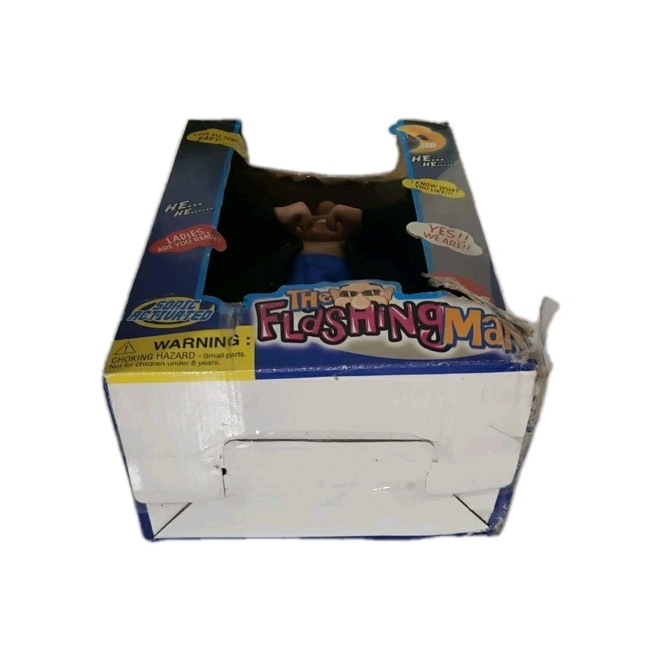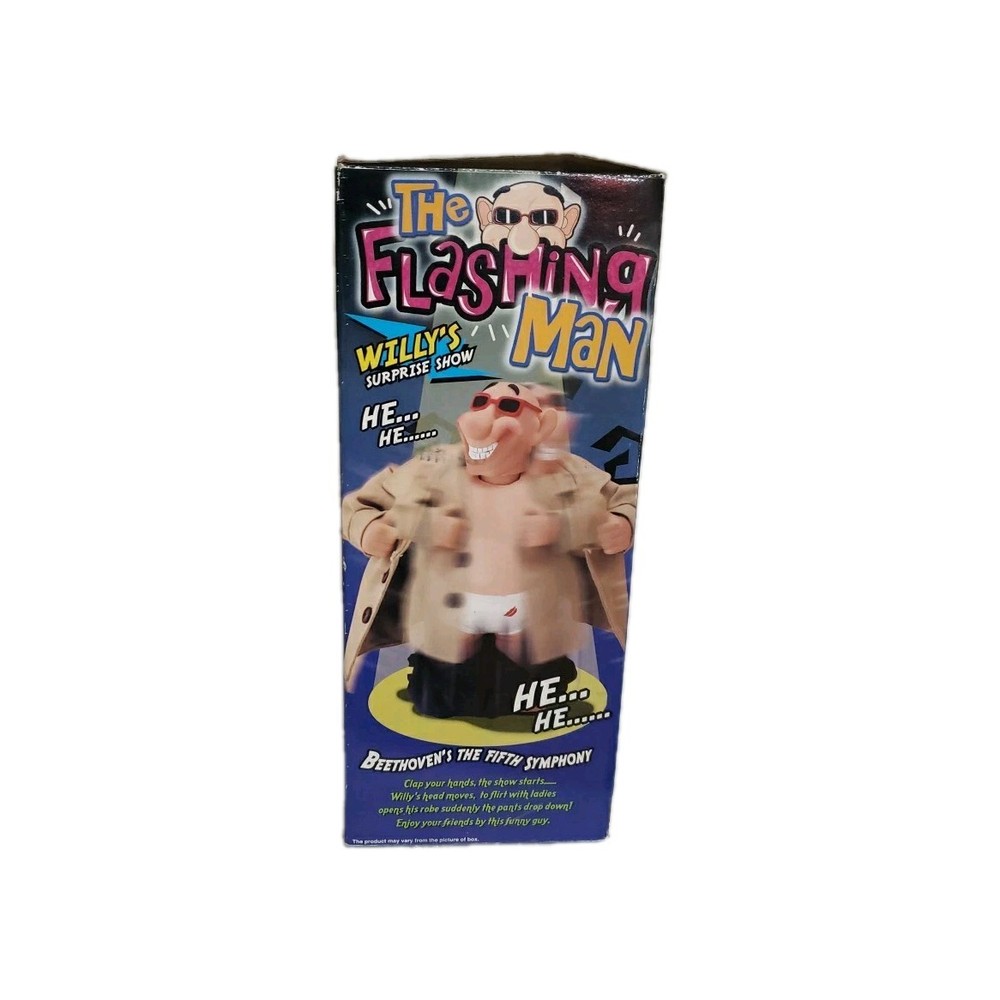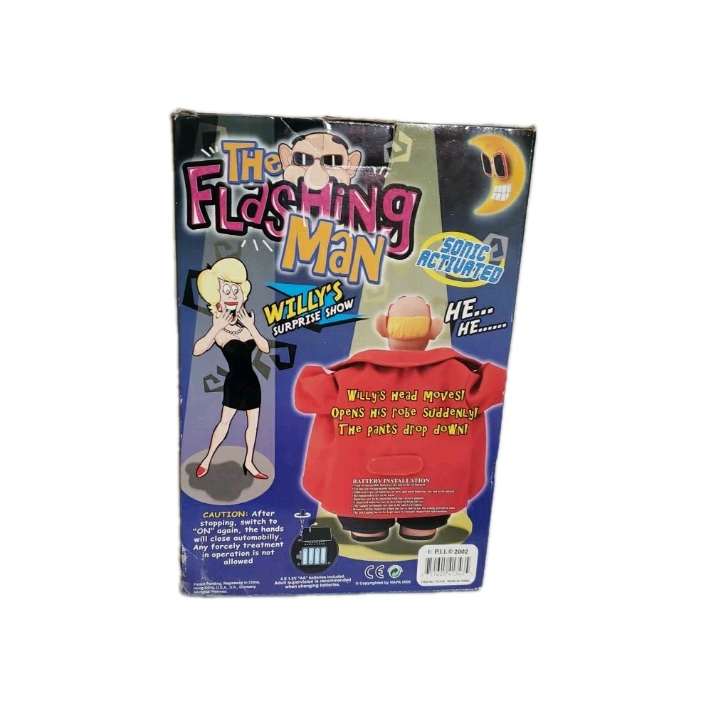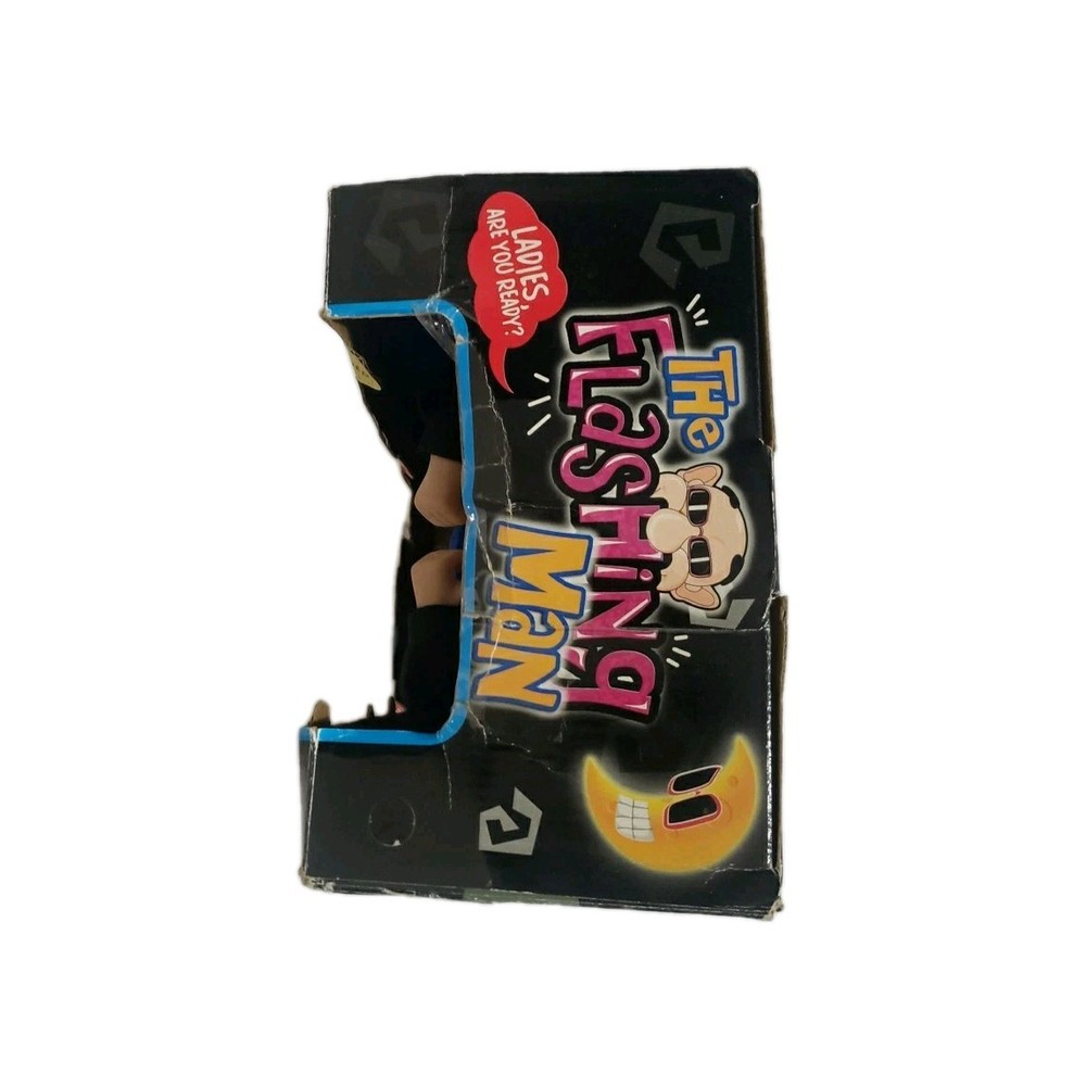 The Flashing Man is a vintage and rare novelty animatronic toy once sold at various retailers including Spencers. This character collectible is sure to be a unique addition to any vintage toy collection. With its flashing action and retro charm, it's bound to be a conversation starter and a fun addition to any toy display. Box is quite worn as pictured and the bottom is held together with tape. The figure is still attatched with orginal plastic to the back of the box. Has not been opened up and tested. May need new batteries. Figure is in Like New condition.