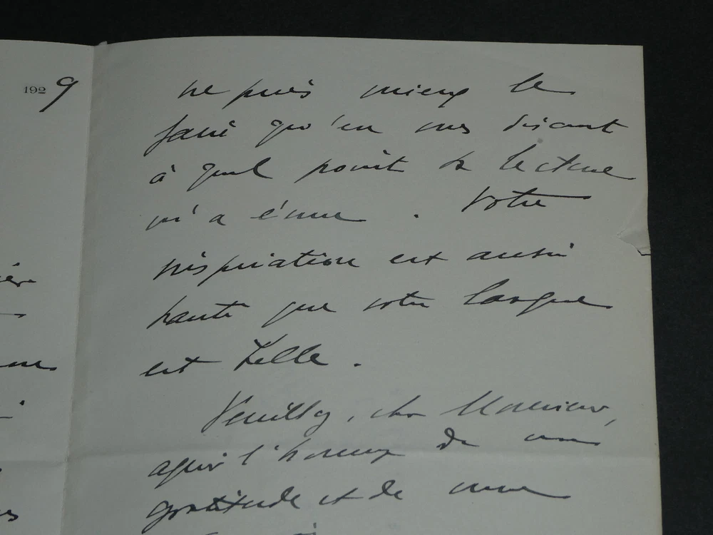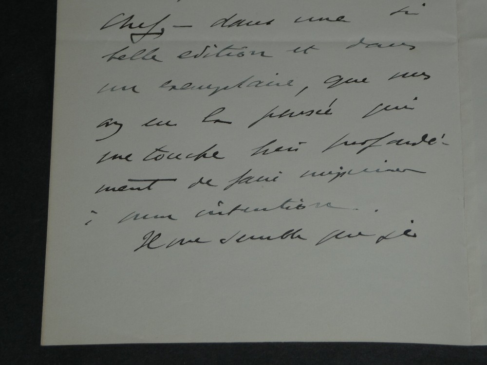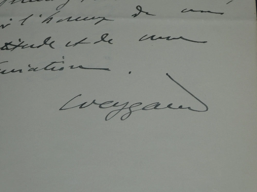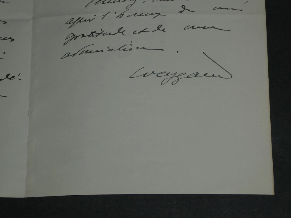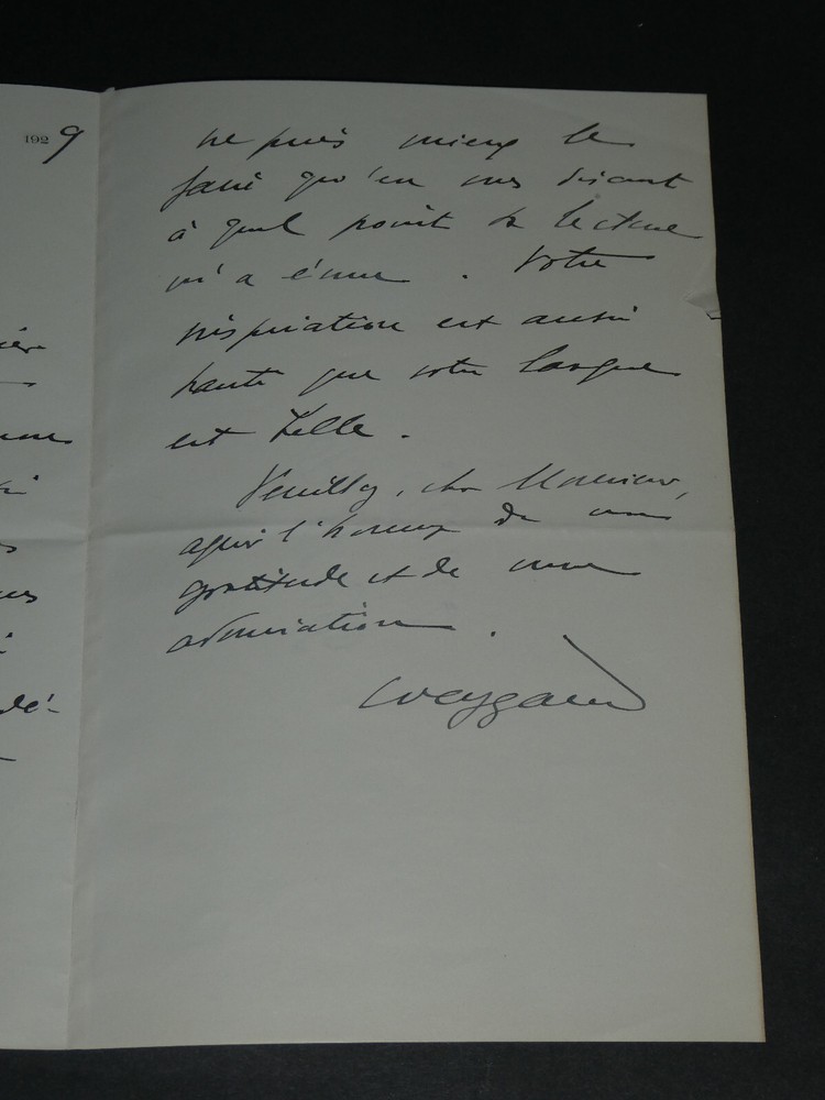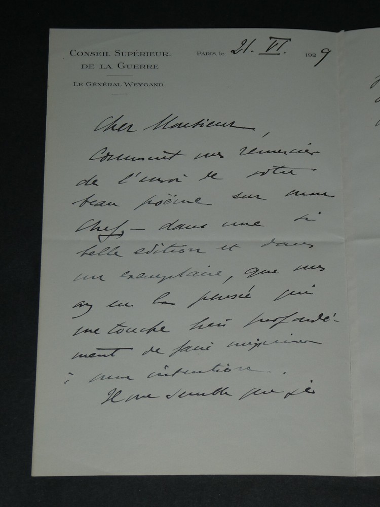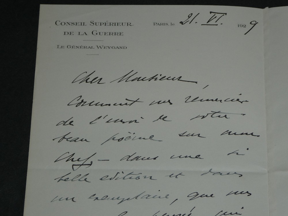 Kostenlose eBay-Eintragsvorlage, entworfen von dewiso.com The General Weygand - Brief Autogramm Signiert Armand Godoy - Foch - 1929 Die Beschreibung dieses Artikels erfolgte durch automatische Übersetzung. Bei anstehenden Fragen, wenden Sie sich bitte an uns. General Maxime Weygand. Handschriftlicher Brief mit Unterschrift an Armand Godoy, Foch, 1929 Handschriftlicher Brief, signiert von General Maxime Weygand, angesprochen an Armand Godoy, geschrieben mit schwarzer Tinte auf Pergamentpapier mit Wasserzeichen und mit dem Briefkopf des „Oberen Kriegsrates“, bezüglich der Zusendung seiner Gedichtsammlung zum Gedenken an Marschall Ferdinand Foch, datiert auf den 21. Juni 1929 . „Sehr geehrter Herr, wie kann ich Ihnen dafür danken, dass Sie Ihr wunderschönes Gedicht über meinen Chef in einer so schönen Ausgabe und in einem Exemplar geschickt haben, von dem Sie dachten, dass es mich zutiefst berührt, für mich drucken zu lassen. Es scheint mir, dass ich das nicht besser machen kann, als Ihnen zu erzählen, wie sehr mich die Lektüre bewegt hat. Ihre Inspiration ist so hoch wie Ihre Zunge schön ist. Bitte, sehr geehrter Herr, nehmen Sie den Tribut meiner Dankbarkeit und Bewunderung entgegen.“ Abmessungen: 13,4 x 21 cm Zustand : Tabulatorzeichen auf der Rückseite des Briefes. Weitere Informationen finden Sie auf den Fotos. Anzahl Seiten: 2 Seiten Maxime Weygand Maxime Weygand, geboren am 21. Januar 1867 in Brüssel (Belgien) und gestorben am 28. Januar 1965 in Paris (Seine), ist ein französischer General, Großkreuz der Ehrenlegion, Militärmedaillengewinner und Mitglied der Französischen Akademie . Während der beiden Weltkriege spielte es eine wichtige Rolle. Wikipedia Armand Godoy Armand Godoy, 1880 in Havanna geboren und 1964 in Lausanne gestorben, ist ein symbolistischer Dichter kubanischer Herkunft. Zunächst im kubanischen Tabakhandel tätig, änderte er im Alter von vierzig Jahren seine Sprache, um ein französischer Dichter „in der Sprache Baudelaires“ zu werden, und ließ sich 1919 in Paris nieder. Wikipedia Ferdinand Foch Ferdinand Foch, geboren am 2. Oktober 1851 in Tarbes in den Hautes-Pyrénées und gestorben am 20. mars 1929 in Paris, ist General, Marschall von Frankreich und Mitglied der Französischen Akademie. Im Ersten Weltkrieg 1918 zeichnete er sich als Generalissimus der alliierten Streitkräfte an der Westfront aus. Wikipedia Kontaktieren Sie uns Autogrammbriefe, alte Papiere, alte Bücher, Fotografien, Gravuren, Briefmarken... Wir bewerten und/oder kaufen Ihre Briefe, Briefsammlungen und alten Bücher in ganz Frankreich. Zahlung Es werden Zahlungen per eBay, PayPal, Überweisung oder Scheck akzeptiert. Senden Sorgfältige Lieferung in stabiler, wasserdichter Verpackung innerhalb von drei Tagen. Berücksichtigen Sie zusätzlich die üblichen Verzögerungen bei der Post. Zurück Zufriedenheit garantiert oder Ihr Geld zurück. Wenn Sie nicht vollständig zufrieden sind, erfolgt die Rücksendung auf Kosten des Verkäufers für Europa. Auf Kosten des Käufers für den Rest der Welt. Handschriftlicher Brief, signiert von General Maxime Weygand, angesprochen an Armand Godoy, geschrieben mit schwarzer Tinte auf Pergamentpapier mit Wasserzeichen und mit dem Briefkopf des „Oberen Kriegsrates“, bezüglich der Zusendung seiner Gedichtsammlung zum Gedenken an Marschall Ferdinand Foch, datiert auf den 21. Juni 1929.„Sehr geehrter Herr, wie kann ich Ihnen dafür danken, dass Sie Ihr wunderschönes Gedicht über meinen Chef in einer so schönen Ausgabe und in einem Exemplar geschickt haben, von dem Sie dachten, dass es mich zutiefst berührt, für mich drucken zu lassen. Es scheint mir, dass ich das nicht besser machen kann, als Ihnen zu erzählen, wie sehr mich die Lektüre bewegt hat. Ihre Inspiration ist so hoch wie Ihre Zunge schön ist. Bitte, sehr geehrter Herr, nehmen Sie den Tribu