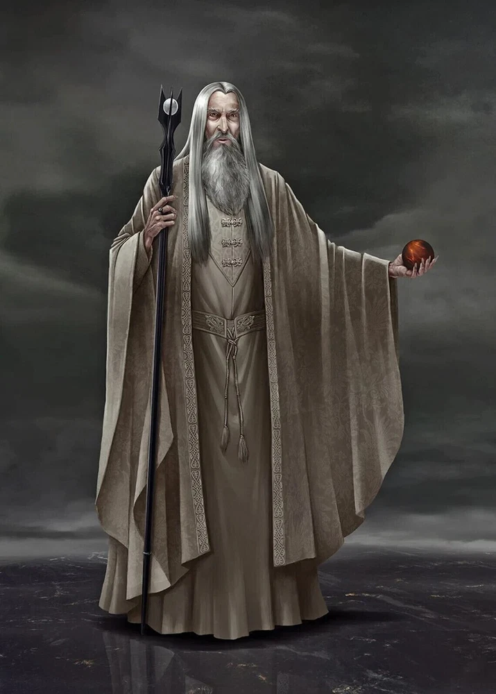 The Hobbit Staff of SARUMAN Black from Lord of the Rings Replica Specifications Staff of Saruman Black: * Overall Length: 65" * Solid Metal Lacquered Finish * Crown cradles a leaded ball The stick is divided into two pieces