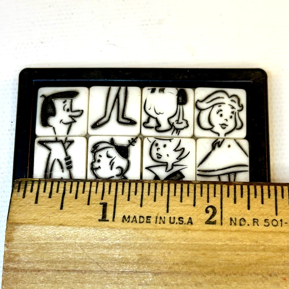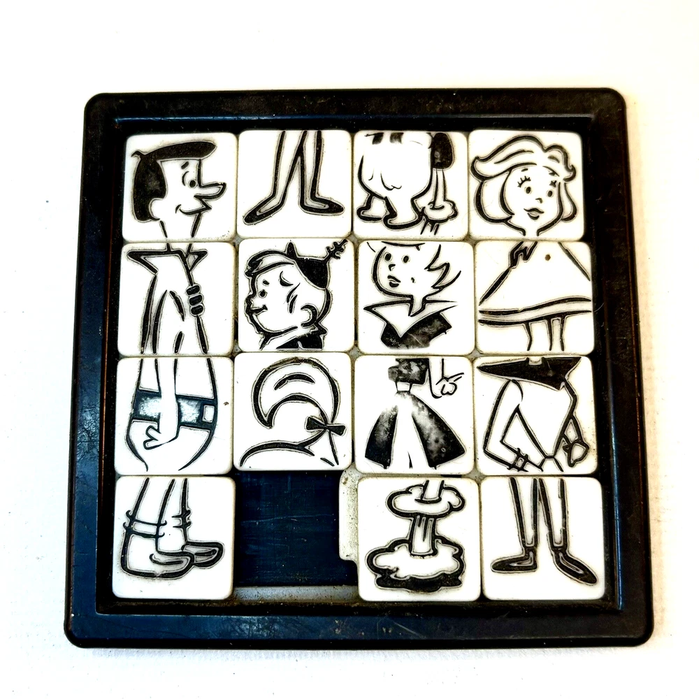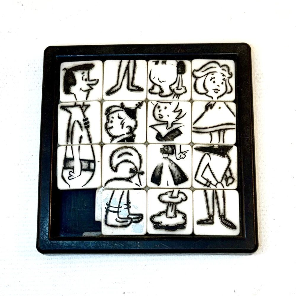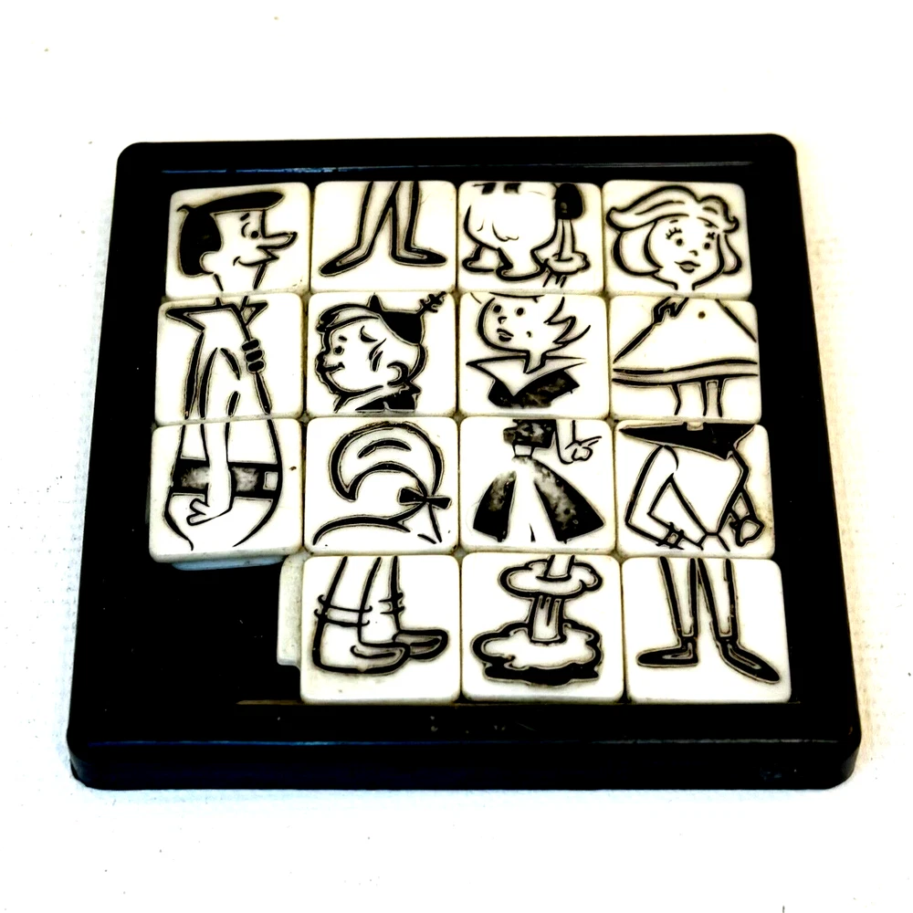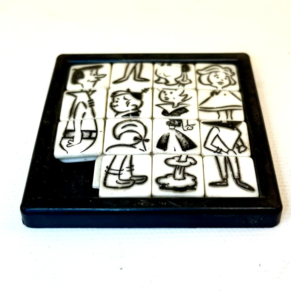 This Jetsons slide puzzle by Roalex is a must-have for any fan of the classic Hanna-Barbera cartoon. The puzzle is a great addition to any collection of animation merchandise or collectibles. Perfect for fans of The Jetsons and anyone who loves a good puzzle challenge, this Jetsons slide puzzle is a great find. • The Jetsons featuring George, Jane, Judy and Elroy! • The puzzle is from the 1960s and is in excellent shape, ready to be assembled and enjoyed. • Size: 2.5" • Condition: Great pre-owned, vintage condition, with wear on the back of the puzzle. The back shows paper residue where the game was originally attached to the card. The squares slide easily, and the tiles show wear commiserate with the age of the toy.