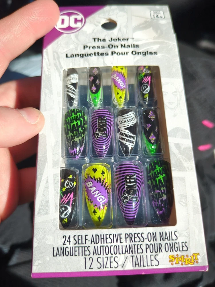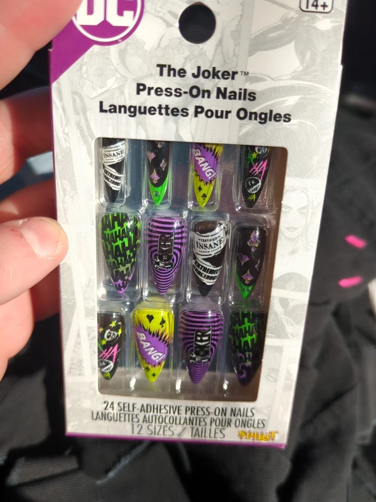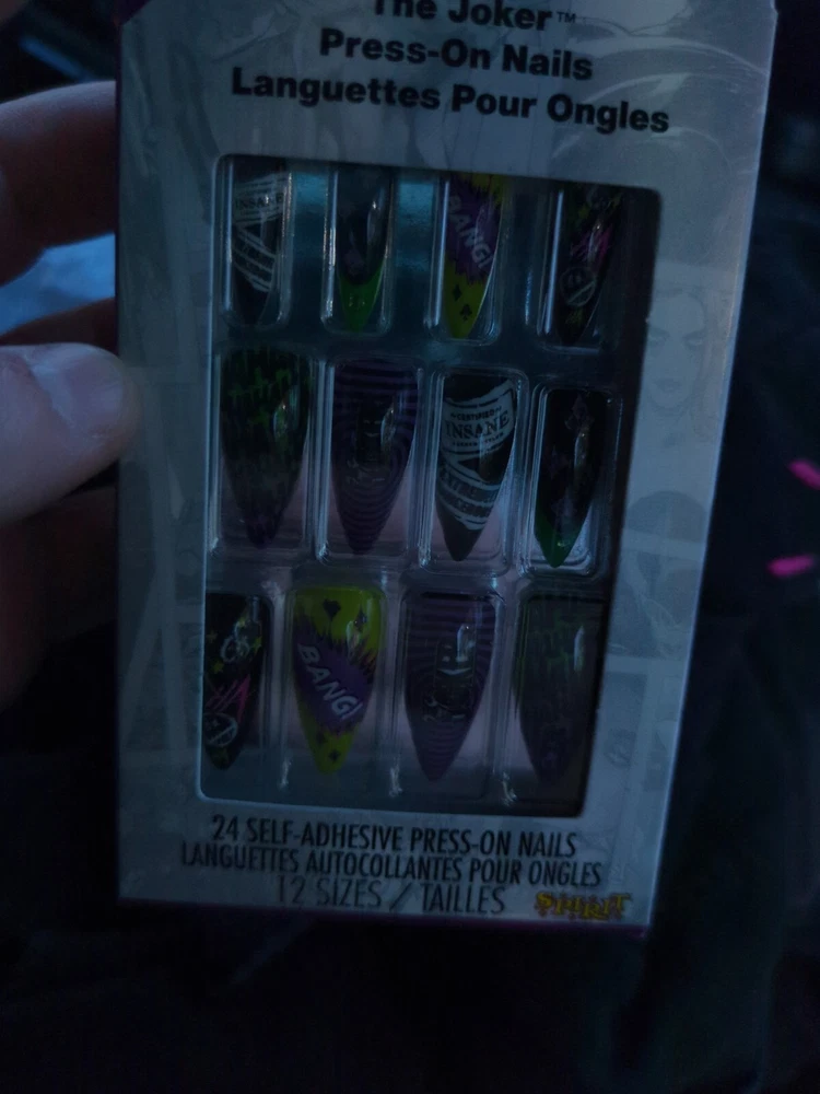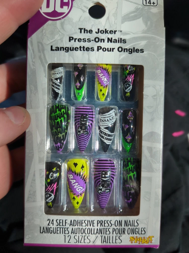 Suitable For:Finger, Nail ArtColor:Multicolorgtin13:Does not applyNail Size:MediumMaterial:ABSBrand:Hot TopicTheme:The JokerShape:AlmondFeatures:Full Cover, Glue Included, Pre-Designed, DetachableUPC:Does not applyType:Press-On Nails