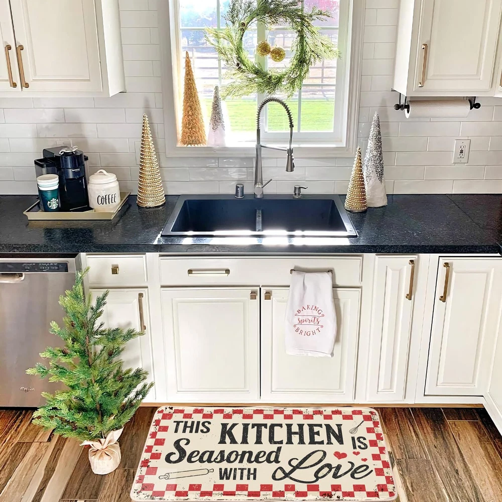 This kitchen mats set includes 2 floor mats: Measures 17" x 29" and 17" x 47", features 0.25" slim. Material: Made of 5% polyester and 95% rubber backing, which is not easy to fade and reliable to use. Durable and Non-slip : Backed with non-slip rubber and topped with polyester felt that is low-profile to reduce chances of tripping. Easy to clean: No scrubbing needed. Just spray off with a hose or use a sponge and mild detergent to clean off dirt. Awesome Kitchen Decor: These mats with funny quotes will make a beautiful addition to your kitchen, dining room, craft rooms and office spaces, as well as a perfect housewarming gift.