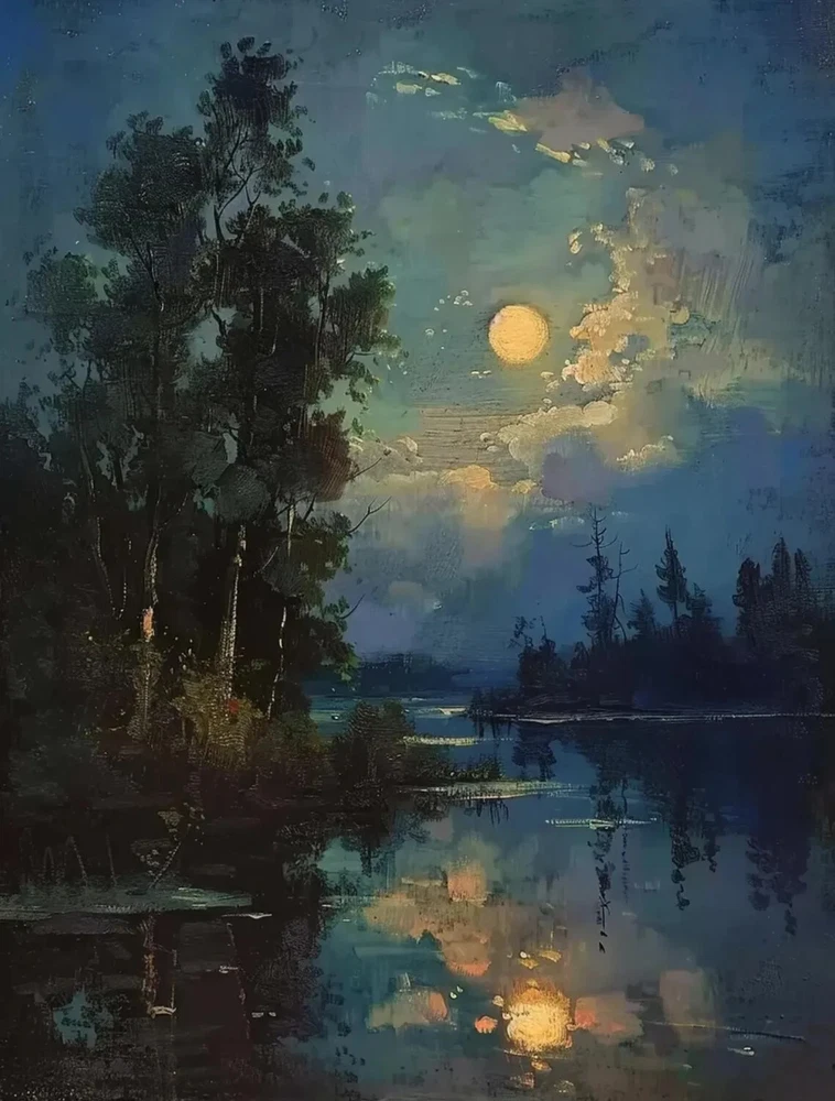 The Lakeside Golden Moon Night Paint Unframed Canvas Print Australian Wall Art