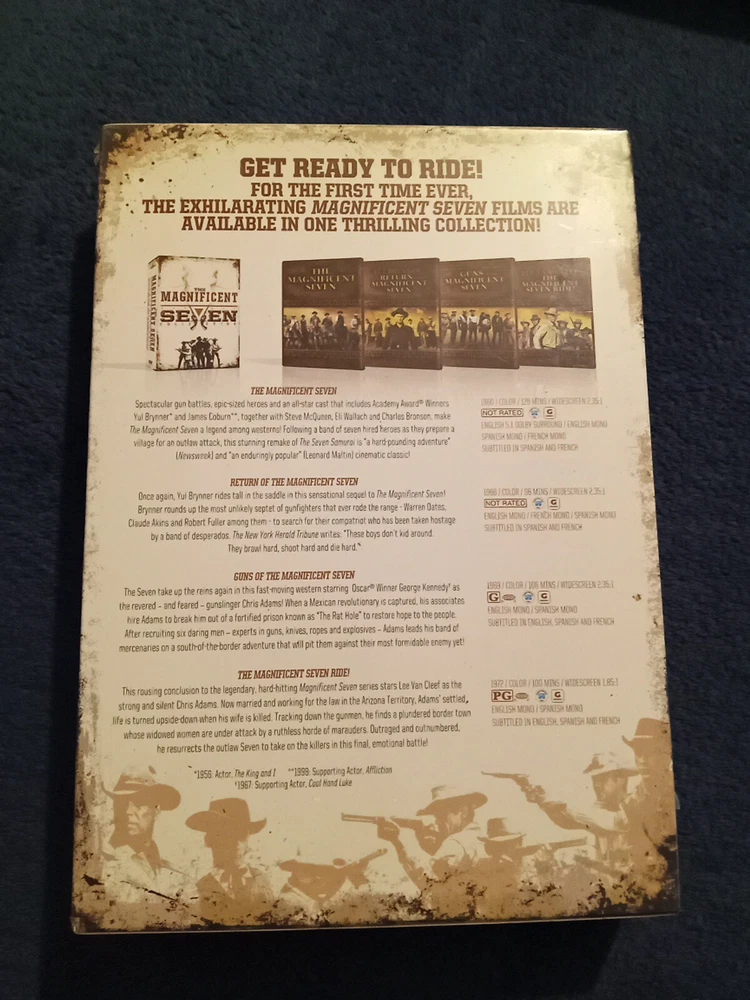 gtin13:0883904106920Edition:4-Disc SetType:MovieRating:NRUPC:0883904106920Genre:WesternsDirector:John Sturges, Burt Kennedy, George MccowanFormat:DVDActor:Yul Brynner, Eli Wallach, Lee Van Cleef, Steve McQueen, Stefanie Powers, George KennedyMovie/TV Title:Magnificent Seven 4-PackRelease Year:2009