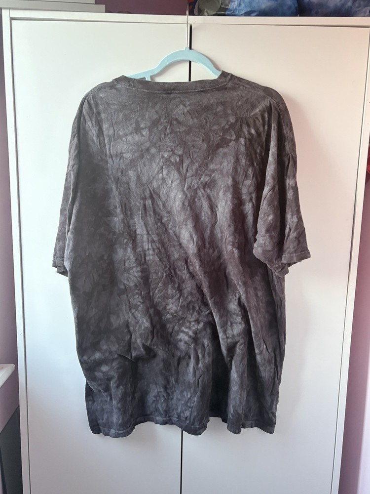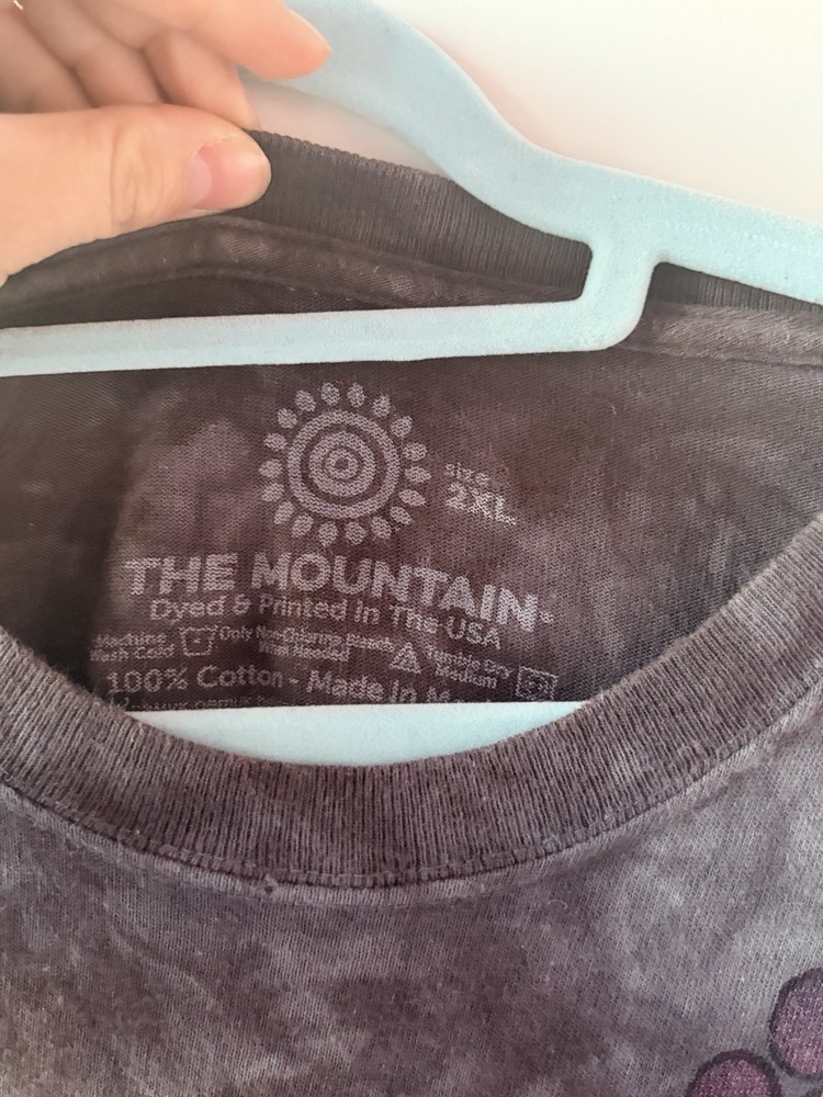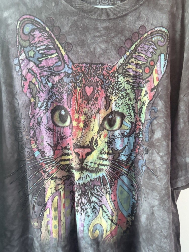 The Mountain "Abstract Colorful Cat" Dark Grey Tie-Dye T-Shirt in 2XL size is a unisex graphic print tee featuring a round neck and short sleeves. Made from cotton, this machine washable shirt is designed with a regular fit and a logo accent. Perfect for cat lovers and the summer season, this T-shirt from The Mountain is a stylish and comfortable addition to any wardrobe.