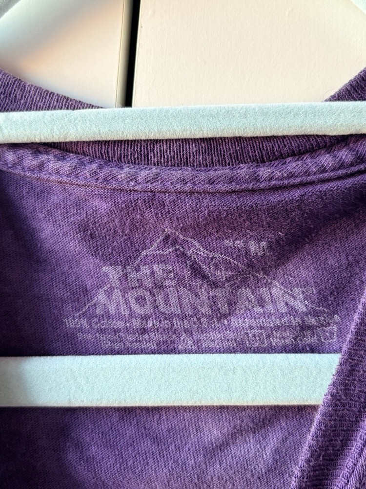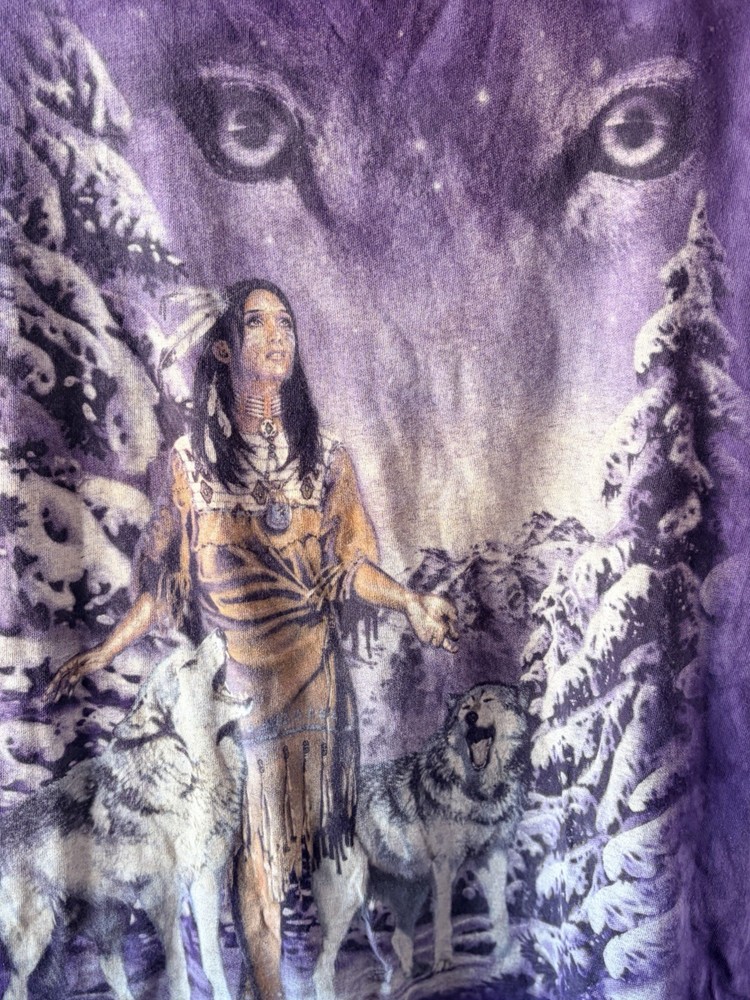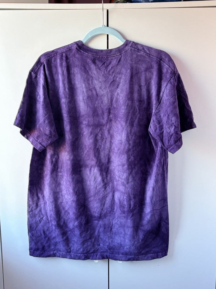 The Mountain Purple Tie Dye Wolf & Native American Graphic T-Shirt in size Medium is a stylish and comfortable choice for men looking for a unique addition to their wardrobe. Made from cotton and machine washable, this short sleeve t-shirt features a round neckline and a regular fit, making it perfect for the summer season. The animal print pattern in purple adds a bold accent to the design, which is accented by the brand's logo. Perfect for those who appreciate the beauty of nature and Native American culture, this shirt is a great choice for casual wear.