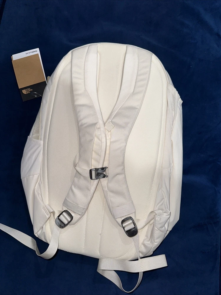 This beautiful white backpack from The North Face is perfect for any outdoor adventure or casual day out. The large size and rectangular shape make it easy to carry with the adjustable shoulder strap and padded features. The backpack includes a zippered closure with the brand's logo accent and several pockets for storage. The interior lining is made of beige polyester and features a laptop sleeve for protection. The backpack is personalized with the character Isabella and is part of The North Face Isabella 3.0 product line. Whether you're traveling or just need a reliable bag for everyday use, this backpack is a great choice. Small stain on bottom