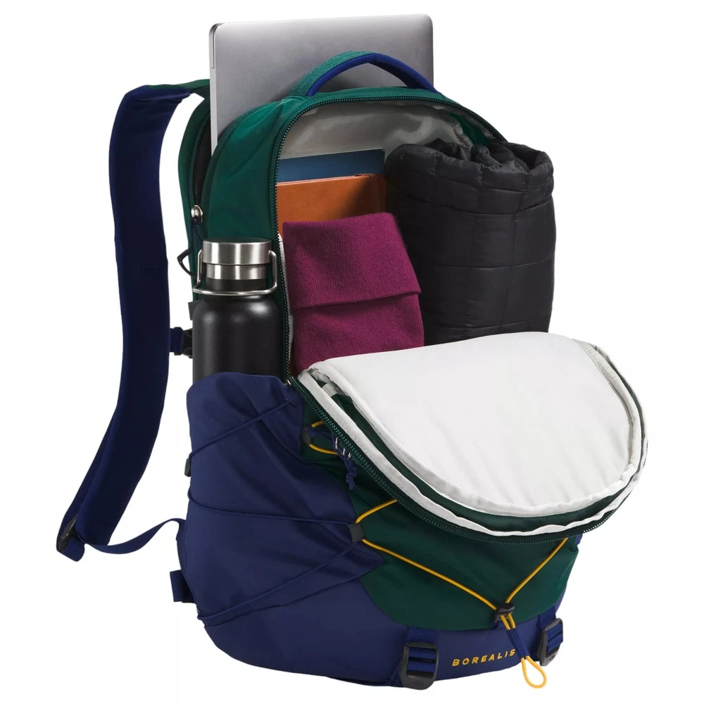 Ideal for both outdoor adventures and daily commutes, this North Face Borealis backpack offers ample storage with a large main compartment and a dedicated, highly protective laptop sleeve. Comfort is a priority with its FlexVent™ suspension system, articulated shoulder straps, and padded top handle, ensuring ease of carry all day long. Stay organized and prepared with multiple pockets, including two external water bottle pockets, a front compartment with secure-zip pockets, and an external fleece-lined pocket for your essentials. FIT & DESIGN Durable water-repellent finish helps keep items in the pack dry and is free of PFC's DESIGN & DETAILS: Updated FlexVent™ suspension system offers comfort and breathability with every carry Stand-up design Articulated shoulder straps bolster comfort Rounded back panel Comfortable stitch lines and soft-touch chemise fabric Large main compartment allows ample storage for books and binders Dedicated, highly protective laptop compartment that fits up to 15” laptops Front compartment has internal organization with secure-zip pockets Padded tablet sleeve in front compartment Two durable external water bottle pockets can easily double as multi-use pockets with quick-draw smartphone access on one side External fleece-lined pocket offers a place to keep your sunglasses, phone or keys U-pull zippers are easy to grab Padded top handle increases comfort Sternum strap complete with a whistle buckle Removable waist belt Bottom compression Side bungee cords allow for compression External bungee-compression system with clips offers more options for organization 360-degree reflectivity enhances visibility FlexVent™ suspension system is certified by the American Chiropractic Association Women-specific version available Brand : The North Face Country of Origin : Imported Style : NF0A52SE Fabric : 210D recycled nylon ripstop; 300D heathered recycled polyester; 600D recycled polyester Bag Style Backpack Dimensions 12” x 6.5” x 19.5” Capacity 28 L Weight 2 lbs. 5 oz. Design Stand-up design | Rounded back panel | Padded top handle | Sternum strap | Whistle buckle | Removable waist belt | External bungee-compression system with clips offers more options for organization Comfort FlexVent™ suspension system offers comfort and breathability | Articulated shoulder straps bolster comfort | Comfortable stitch lines and soft-touch chemise fabric Closure Easy to grab u-pull zippers Compression Bottom compression | Side bungee cords allow for compression Pockets Large main compartment allows ample storage | Front compartment has internal organization with secure-zip pockets | Padded tablet sleeve in front compartment | Two durable external water bottle pockets double as multi-use pockets with quick-draw smartphone access on one side | External fleece-lined pocket offers a place to keep your sunglasses, phone or keys Laptop Pocket Highly protective laptop compartment fits up to 15” laptops Technology PFC-free durable water-repellent finish helps keep items in the pack dry | 360-degree reflectivity enhances visibility Fabric 210D recycled nylon ripstop | 300D heathered recycled polyester | 600D recycled polyester Features Padded Laptop/Tablet Sleeve, Laptop Compatible, Water Bottle Pocket, Sternum Straps or Hip Belt, Front Access Pockets, Whistle Buckle, Padded Top Handle, Padded Back Panel, Padded Straps, Internal Organization We offer FAST AND FREE SHIPPING on all USA orders We usually handle the order within 4 days (often 2-3 days), and it usually takes 3 days for delivery. It means you will receive your order no later than 7 days after payment. We use FedEx, USPS or UPS ground Local pick up is not available at the moment We DO NOT offer shipping option to PO BOX address, warehouse address, freight company address. If you have any questions, feel free to ask. Thank you for visiting!
