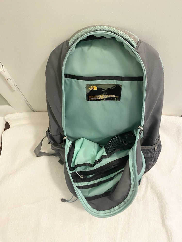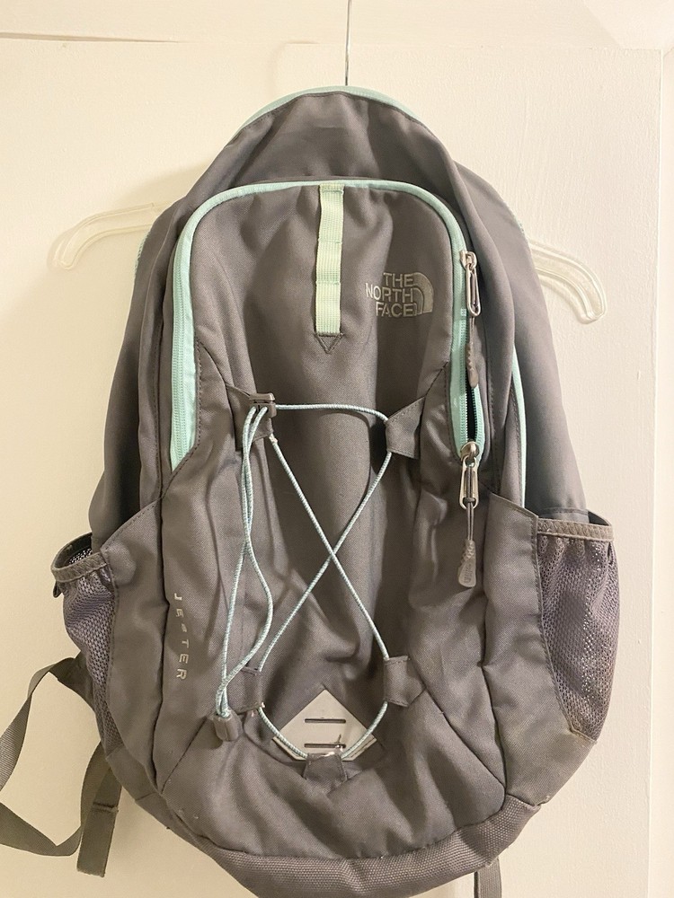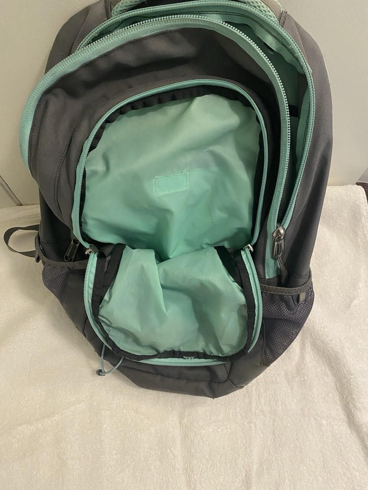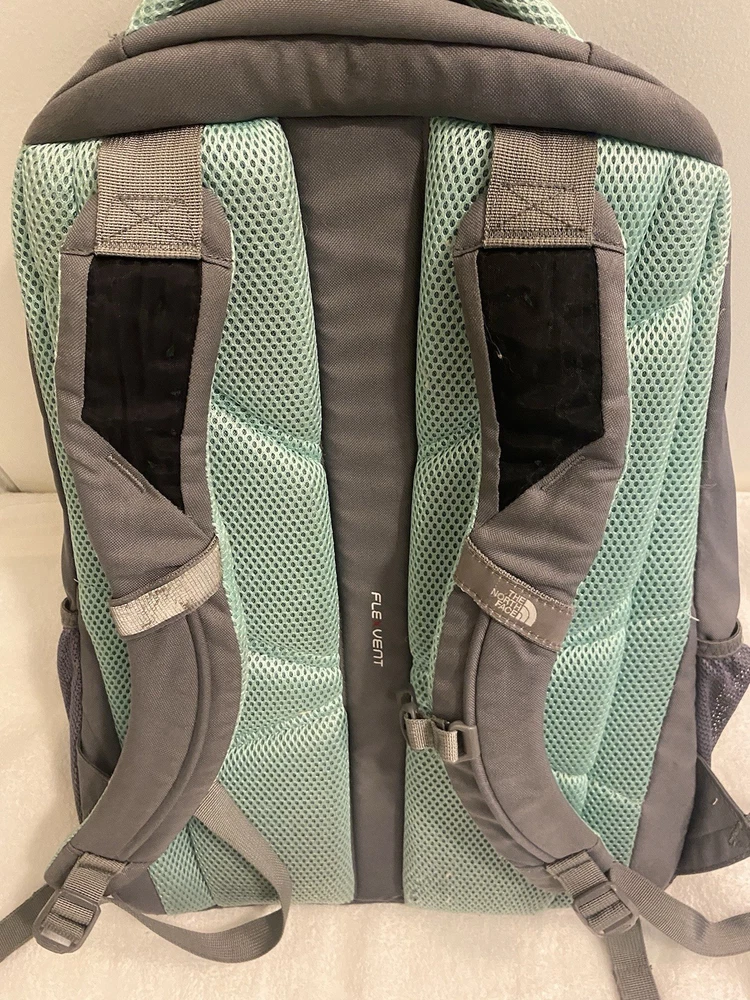 The North Face Jester FLEXUENT Grey/Aqua Backpack is a versatile and durable for hiking, camping or school. Good pre owned Condition. (C-12)