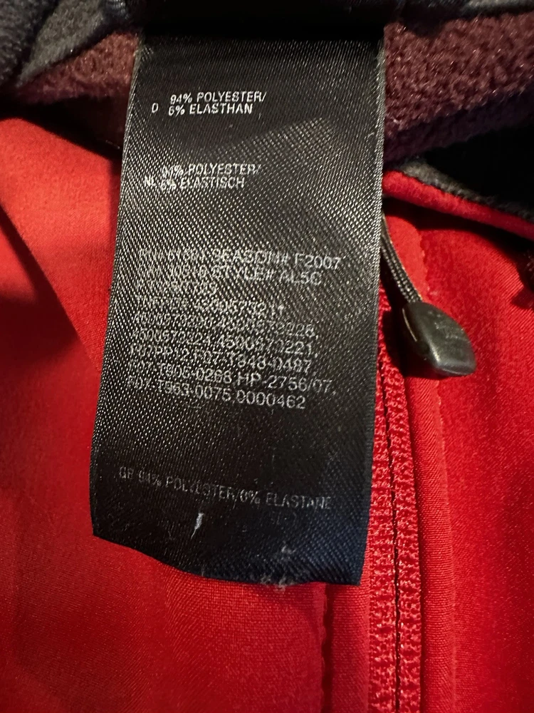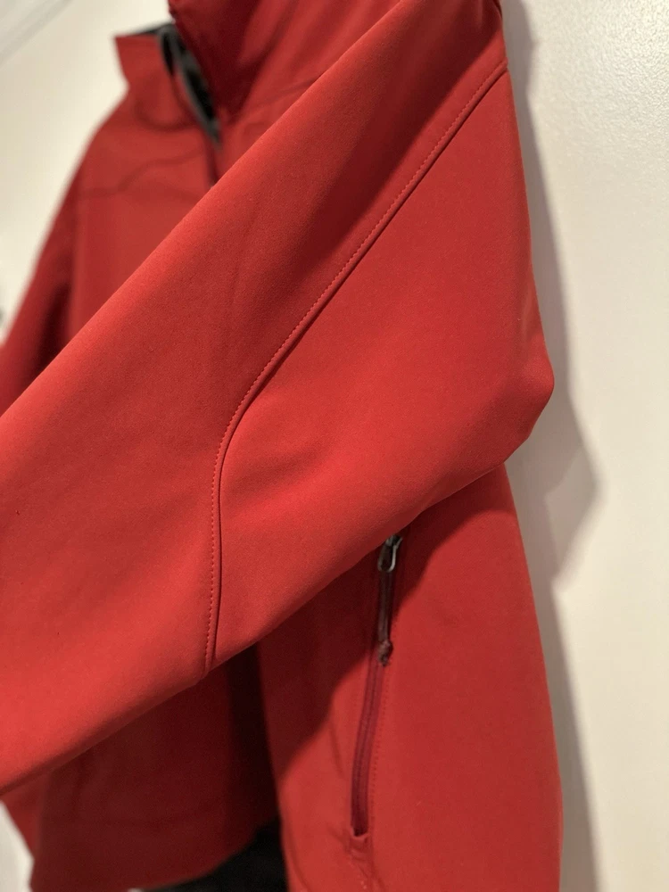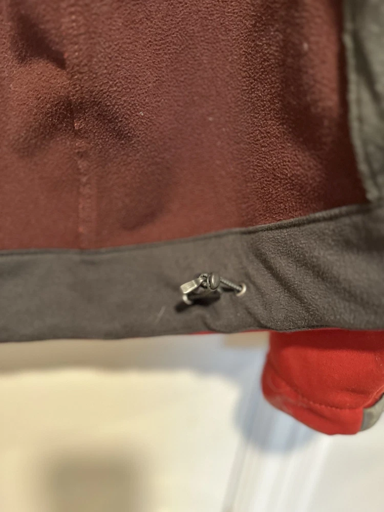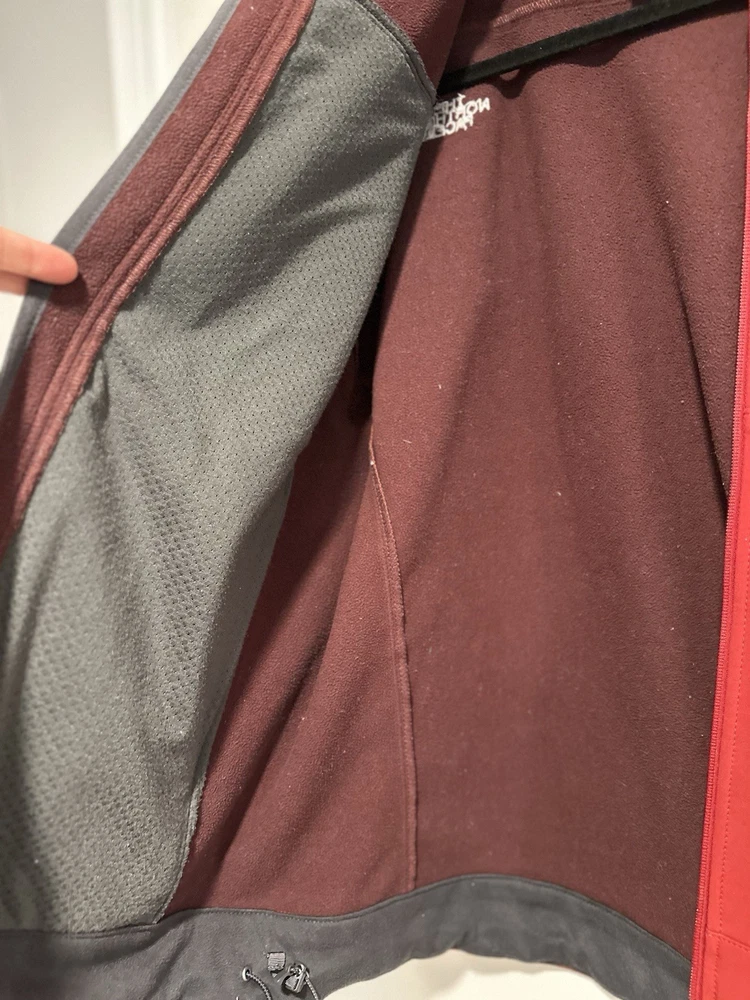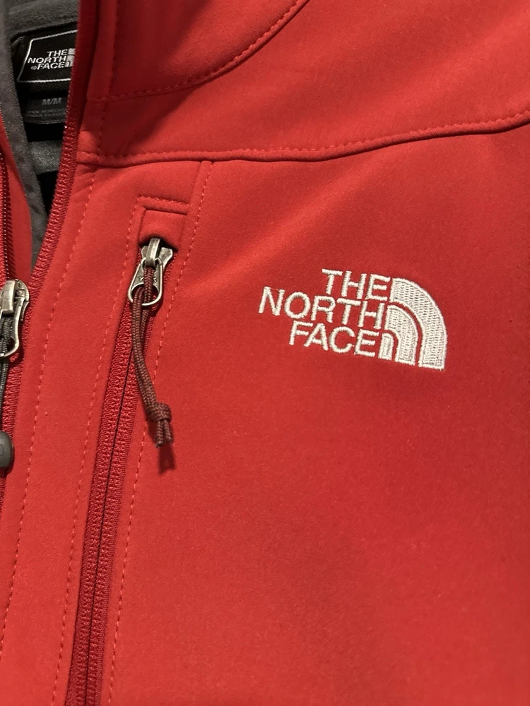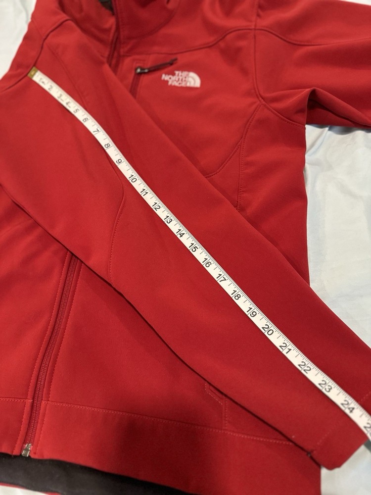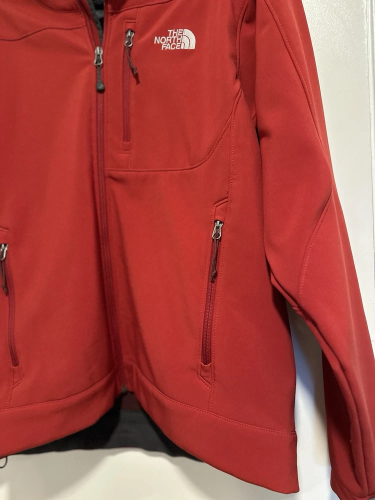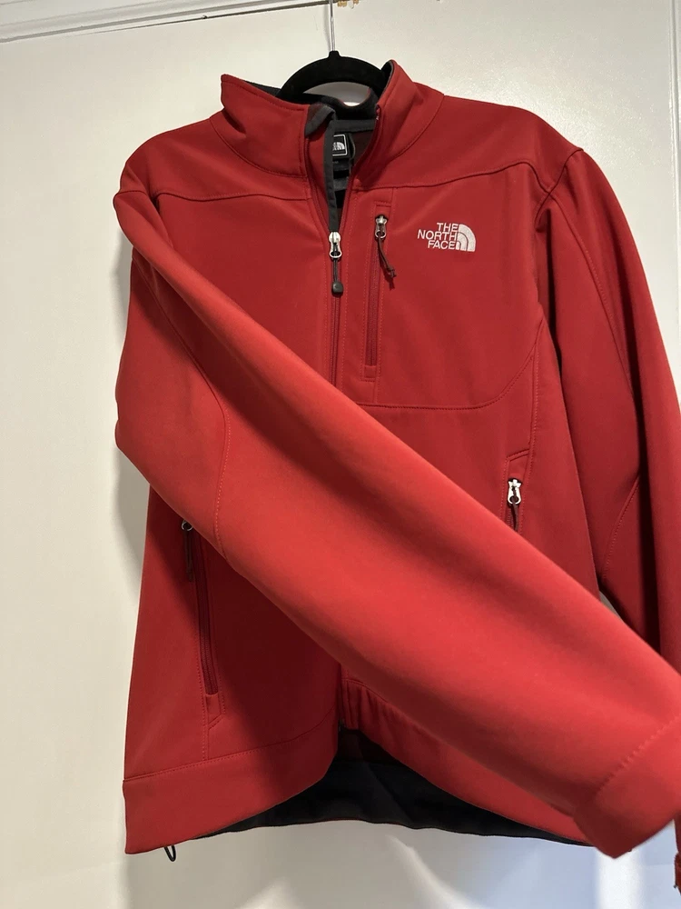 The North Face Mens Medium Apex Bionic Softshell Deep Red Full Zip Jacket. Hand warmer zip pockets. Single zip Chest pocket. Adjustable cuffs. Drawstring waist. Excellent used condition. No rips, stains or defects. Please see pictures for measurements.