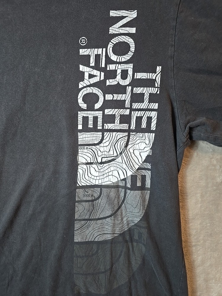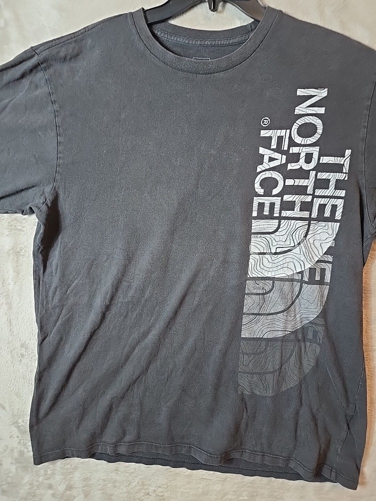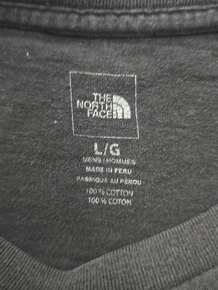 FADED BLACK. This shirt from The North Face is perfect for outdoor activities such as hiking and camping. The shirt is made of cotton and is machine washable, making it easy to care for. It features a solid pattern with a crew neck and short sleeves, providing a comfortable fit for any adventure. The shirt is available in size L and comes in a faded black color with the North Face logo accents. In addition, the shirt has a regular fit and is breathable, making it perfect for summer and spring seasons. It is also collarless, adding to its casual style. The shirt is not vintage and was made in Peru. Overall, this shirt is a great addition to any outdoor wardrobe.