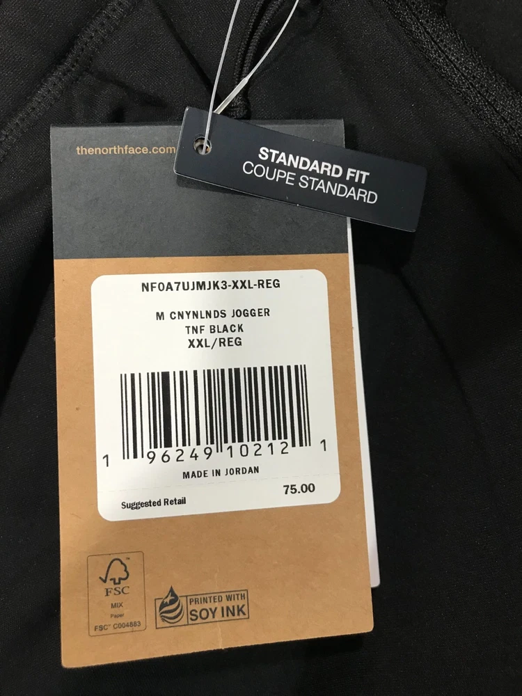 Description: The North Face Men's (Size XXL) Black/White Canyonlands Joggers Sweatpants . (See pictures) Brand: The North Face Gender: Men Size: XXL Color: Black/White Pattern : Solid Material: 96% polyester/4% elastane Condition: New with tags MSRP: $75 Buy It Now Price: $34.99 Shipping: Plus $5.99 for first class package shipping Note: Picture Accuracy is about 90%. Slight variance in color may result, due to lighting and camera default settings.