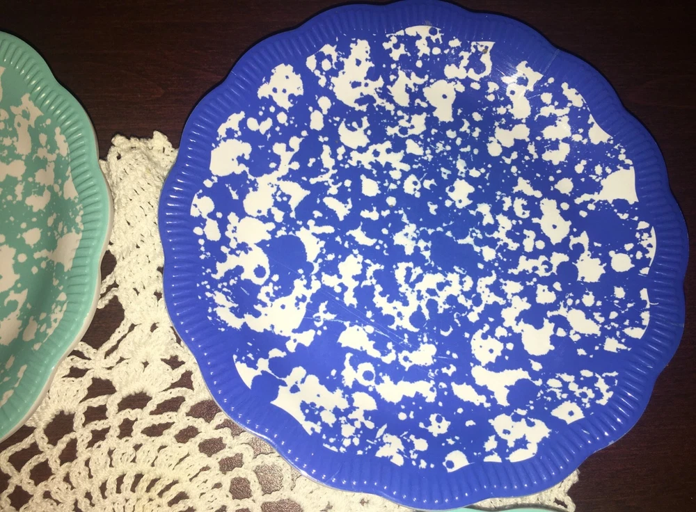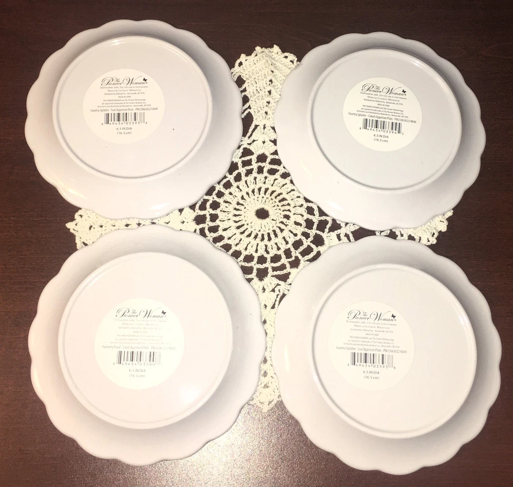 Lot of 4 ~ The Pioneer Woman Country Splatter & Painterly Floral Melamine Appetizer Plates Measure 6 1/2 inch diameter A perfect set for Spring Lot includes: 1 Painterly Floral- Coral 2 Country Splatter - Teal 1 Country Splatter - Cobalt Blue New Carefully packed and shipped by Daisy!