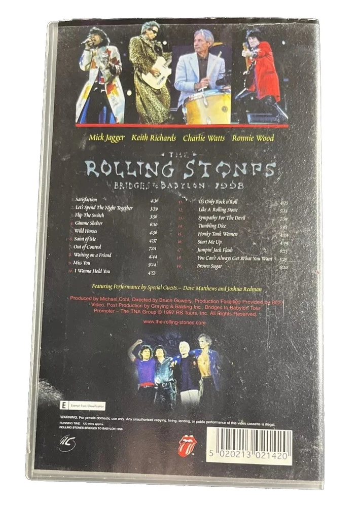 The Rolling Stones Bridges & Babylon Live Concert 1998 VHS tape is a rare find for any music enthusiast. Featuring the legendary band in a captivating live performance, this concert is a must-have for fans of rock and roll. With crisp visuals and clear sound quality, this VHS tape brings the energy and excitement of a live Rolling Stones show right into your living room. Grab this piece of music history today and add it to your collection of classic rock memorabilia. Please note: the VHS is like new the cover is very good Thank you for purchasing from A-ZCollective