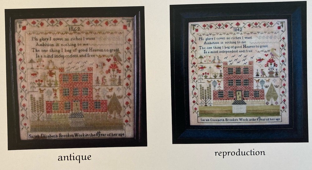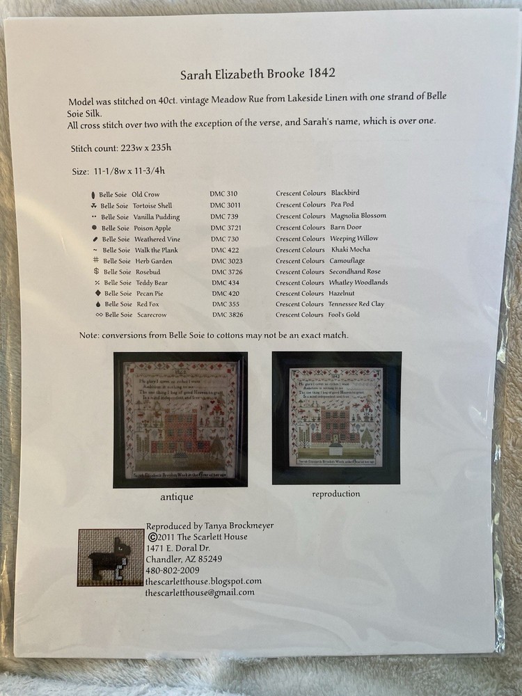 This beautiful sampler, originally designed by Sarah Elizabeth Brooke, was reproduced by Tanya Brockmeyer for The Scarlett House. Features a colorful floral border, home, birds, and the following inspirational quote: “No glory I covet no riches I want Ambition is nothing to me The one thing I beg of good Heaven to grant Is a mind independent and free” Stitched on 40 count vintage Meadow Rue from Lakeside Linens. Stitch Count: 223w x 235h Finished size on 40ct is approximately 11 1/8w x 11 3/4h inches. See photos for more details. Check out my other cross stitch items for sale. I will combine shipping. Please note my no return policy. Item is as described. Tracking included with shipping.