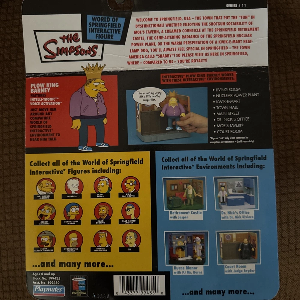 This interactive action figure from The Simpsons World of Springfield collection features Barney, the beloved character from the iconic TV show. The figure is made of durable PVC material and has a scale of 1:12. It was manufactured in China in 2002 by Playmates Toys, a renowned brand in the toy industry. The multicolor figure is an original licensed reproduction and is perfect for collectors and fans of the show. Its vintage design and TV, Movie & Video Games theme make it a unique addition to any collection. Don't miss the chance to own this rare piece of The Simpsons memorabilia!
