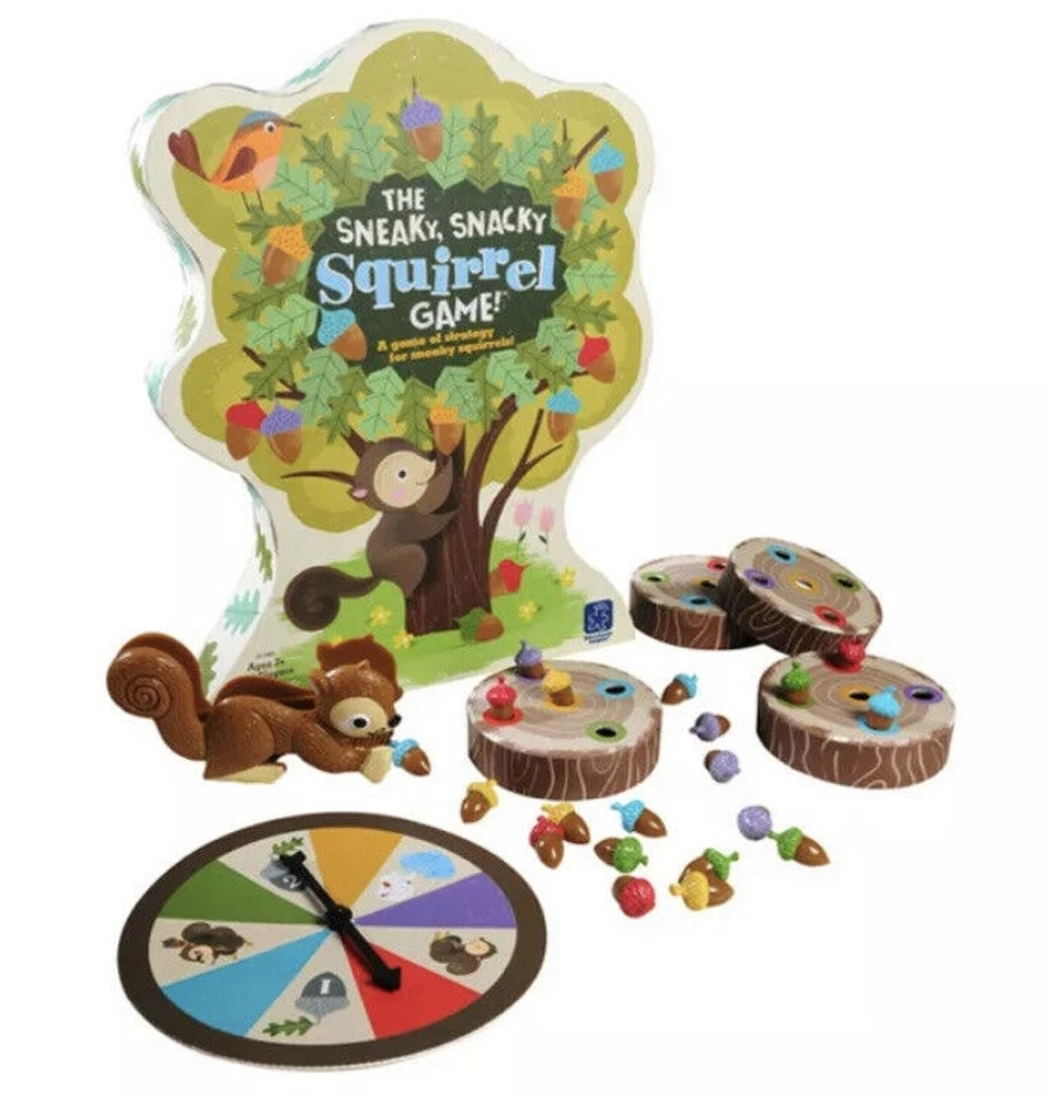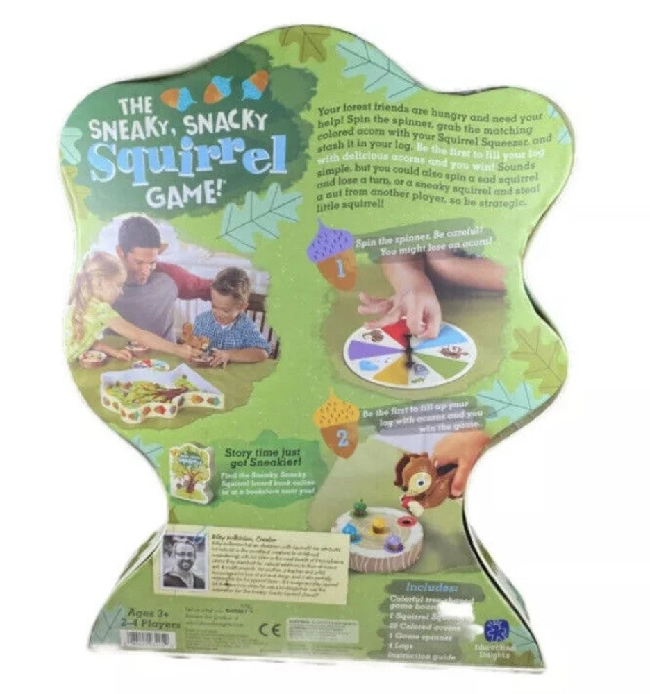 Learning Resources Ed in Sneaky Snacky Squirrel Ages 3+. Condition is "Used". Product Description Your forest friends are hungry and they need your help. Spin the spinner, squeeze the matching colored acorn with your squirrel squeezer, and place it into your log. Be the first to fill your log with delicious acorns and you win. You could also spin pick an acorn, steal an acorn, or lose an acorn, so be strategic, little squirrel. For grades Pre-K+/Ages 3+. 2 to 4 player game. Includes one squirrel squeezer, 20 colored acorns, four logs, one game spinner and game board (doubles as packaging.). Develops matching, sorting, strategic thinking, hand-eye coordination, fine motor skills and pre-handwriting skills.