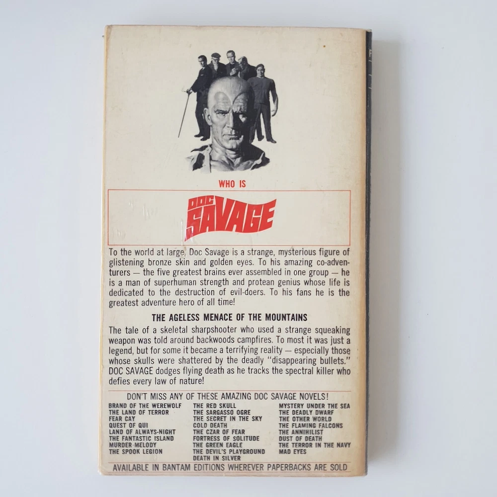 "The Squeaking Goblin" by Kenneth Robeson is a superhero book published by Bantam. This first edition features a softcover with wraps and comes in foil.