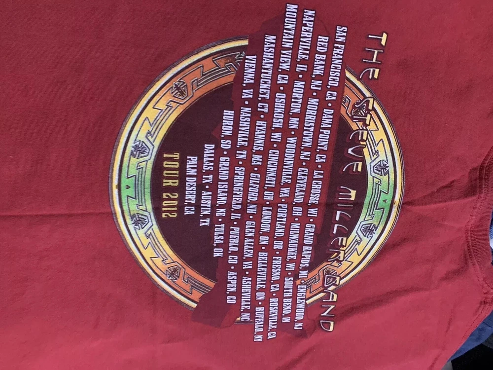 .5Show your love for the Steve Miller Band with this vibrant red T-shirt from their 2012 US tour collection. Made from comfortable cotton material, this short-sleeved shirt features the iconic band logo and character name, Steve. The shirt is available in size L for men and is perfect for any fan of the band. This Gildan brand T-shirt is a must-have for any collector of band merchandise. The shirt is ideal for casual wear and is sure to spark conversations about your love for the Steve Miller Band. Add this unique piece to your collection today!