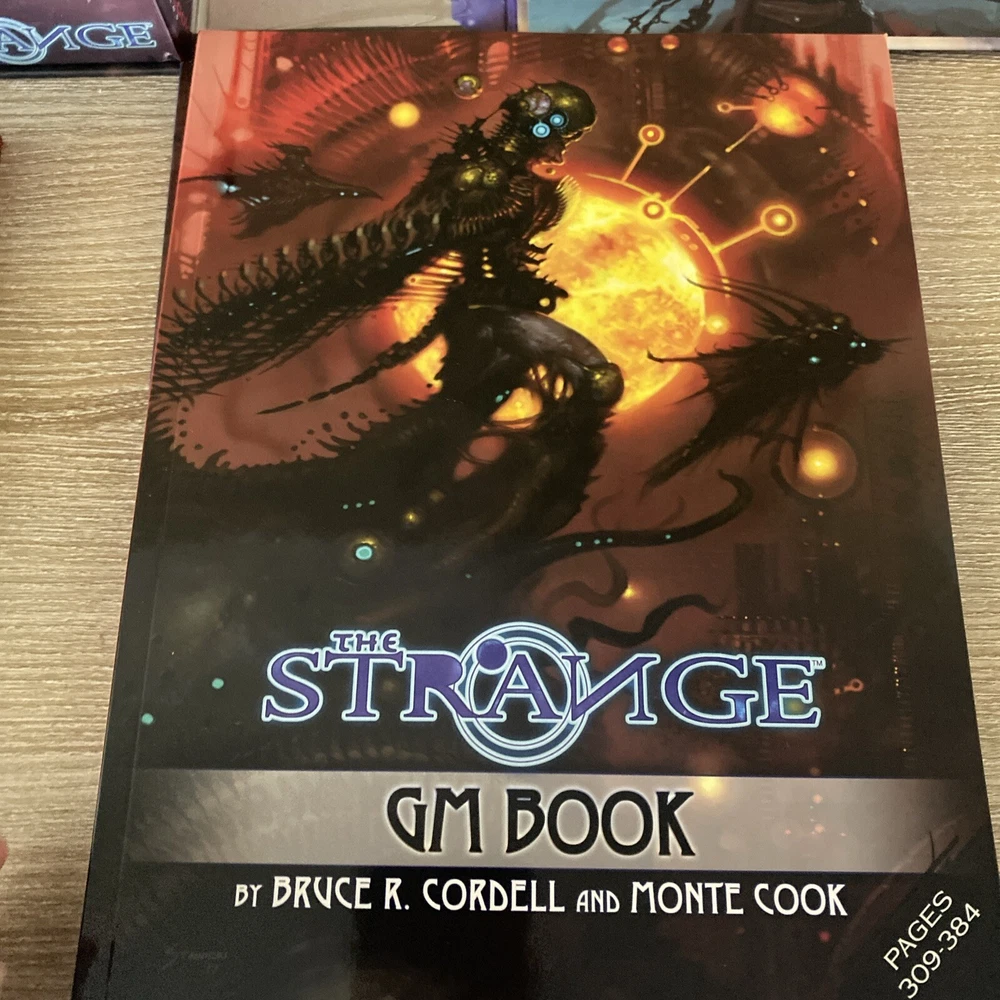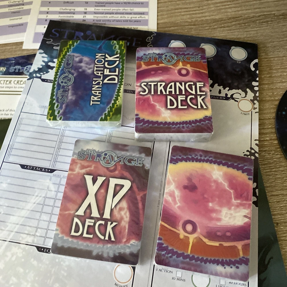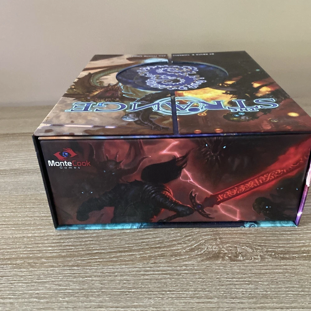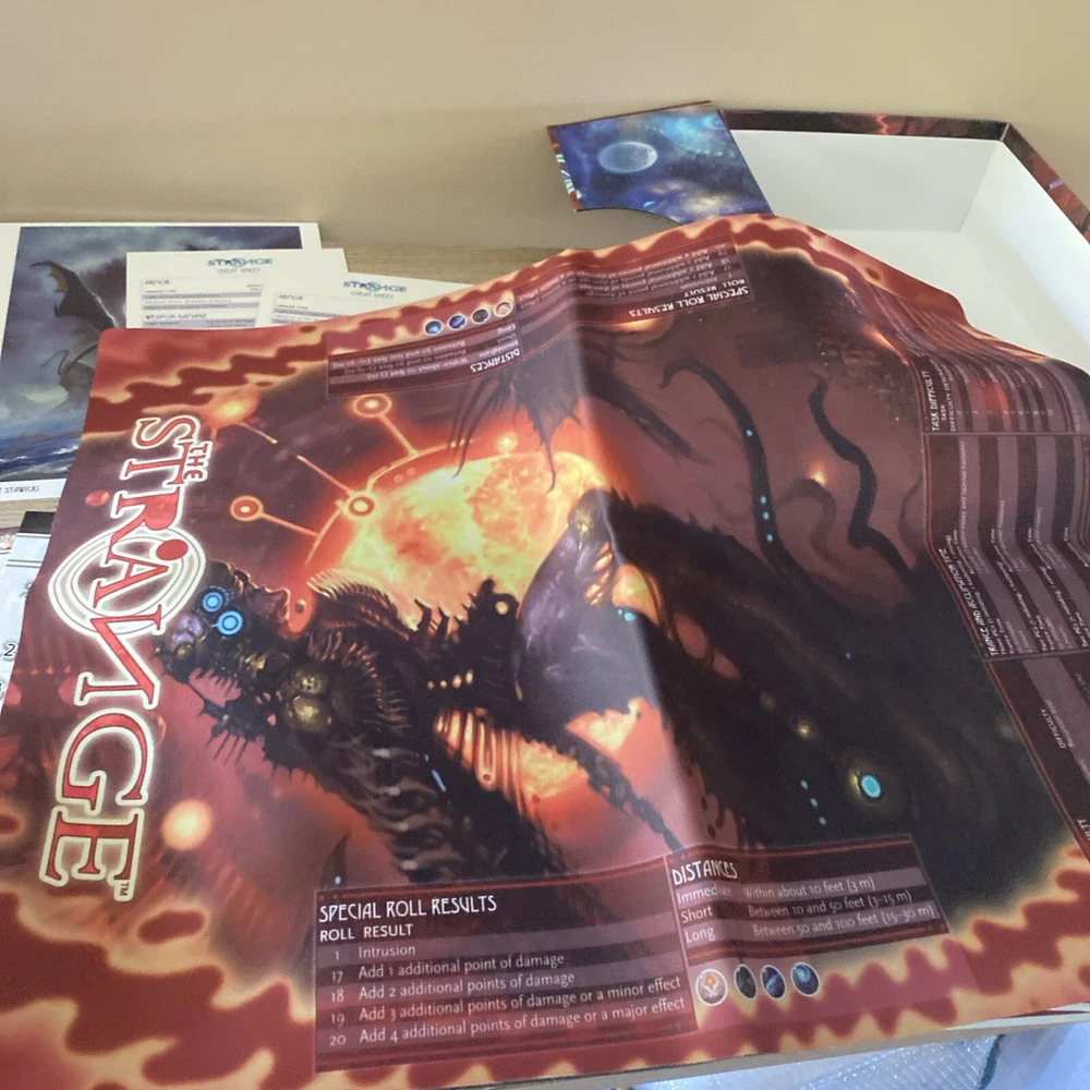 The Strange RPG is where stories, movies, myths, novels and even comics and games come alive in limited alternate dimensions called recursions. Player characters explore these excursions, accumulate treasures and wonders, and defend the Earth from entities they discover who are jealous of - or want to consume - the real world. Recursions float in a medium that scientists call dark energy, but that PCs call the Strange. The Strange was nominated for the Origins Award for Best New Roleplaying Game and received 2 ENnie awards, including awards for best setting, best game and best art. This box set has been opened and does have damage the seal came off but can be glued back and there is a tear on the bottom of the box (see pictures) but all items inside the box are new, all cards are still in original plastic packaging. Please see pictures for all items included in this exclusive box set.