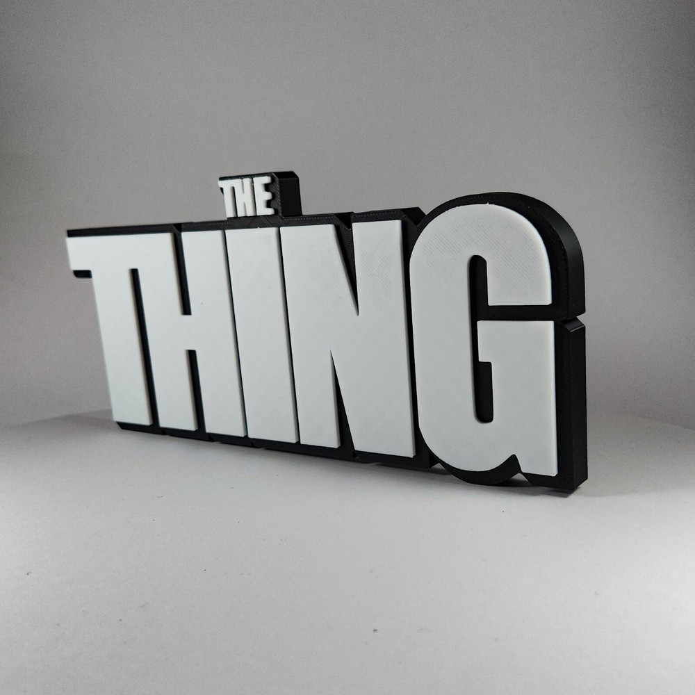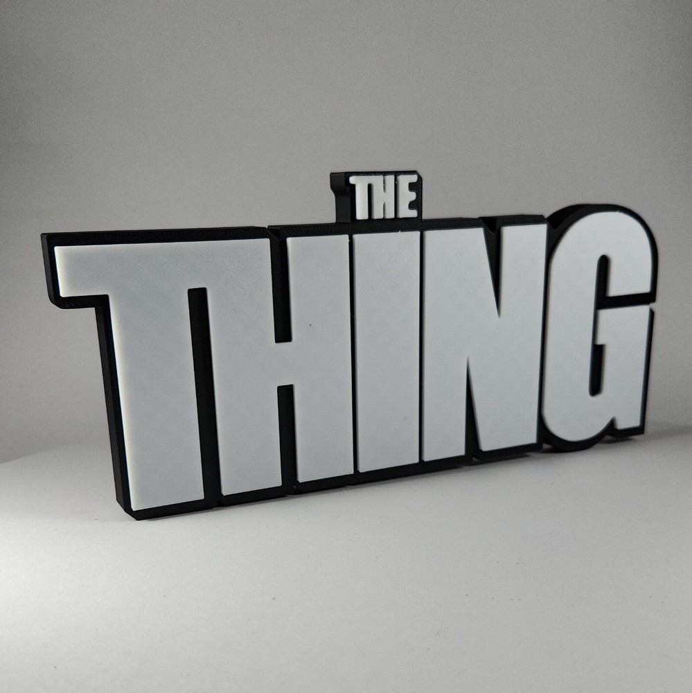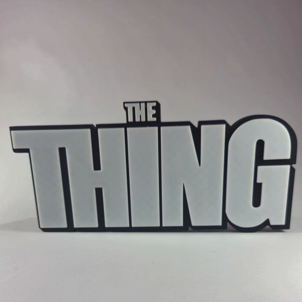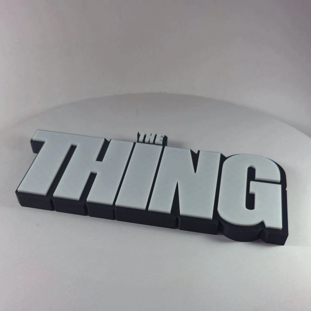 The Thing Sign is a black and white plaque made of PLA material, measuring 8 inches in length 3 1/2 inch high. It features a printed horror movie logo, making it suitable for wall display as a decorative art piece for fans of the movie. This unique item can be used to add a touch of horror-themed decor to a bookcase or shelf in a collector's display. A unique 3D-printed stand/sign, perfect for adding character to your memorabilia art shelf or wall art. Disclaimer: Please note that colors may vary due to material availability. While we strive for accuracy, 3D printing may result in slight color variations from the listing. We use blue and orange materials, but variations may occur.