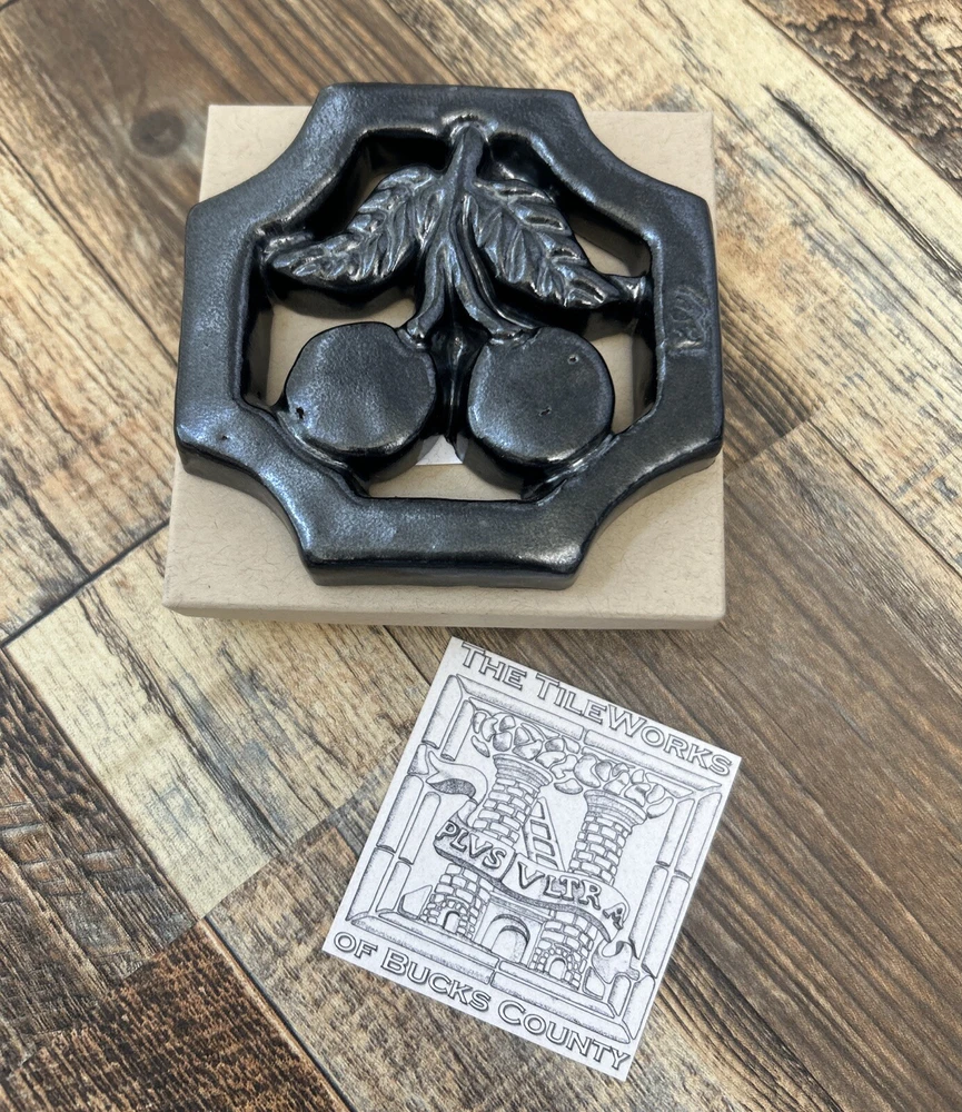 This beautiful tile from Bucks County features a charming design of cherries. It is perfect for collectors of decorative pottery and glassware, especially those who appreciate tiles. The quality of this piece is evident in its durability and attention to detail. New W/Box Measures Approximately 4 inches x 4 inches