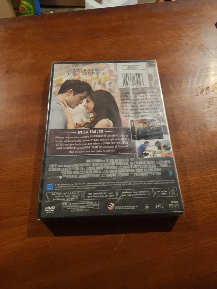 The Twilight Saga: Breaking Dawn Part 1 (Bella's Wedding Dress Edition) is a special edition DVD released in 2011 by Summit Entertainment. This limited edition box set includes additional scenes, commentary, and a widescreen format. The movie is a combination of adventure, drama, fantasy, horror, and romance genres with a rating of PG-13. The story follows Bella Swan, played by Kristen Stewart, and her wedding to Edward Cullen, played by Robert Pattinson, amidst vampire-related challenges. The DVD is region coded for DVD: 1 (US, Canada...) and is in English language.