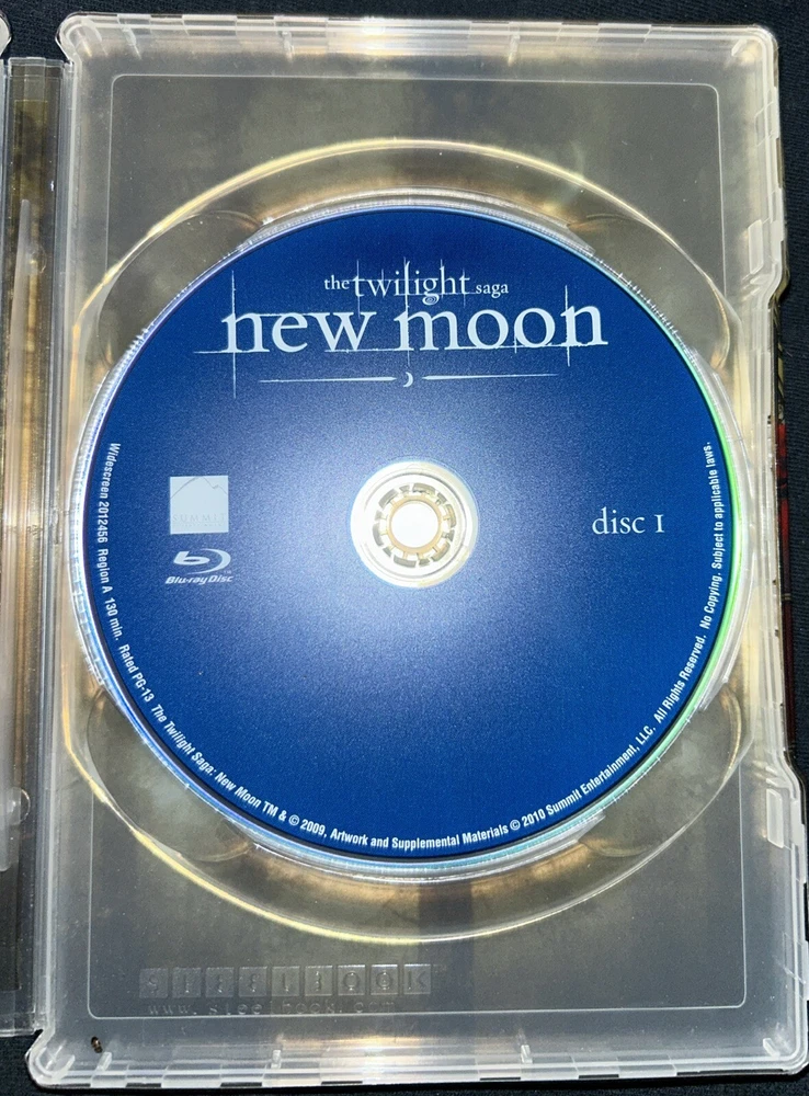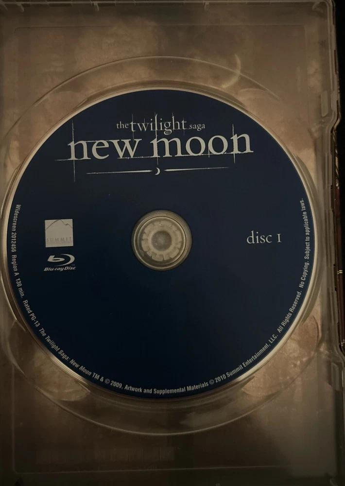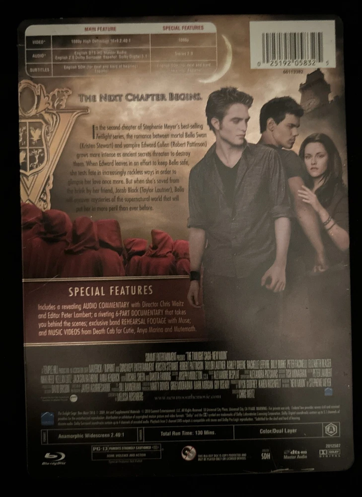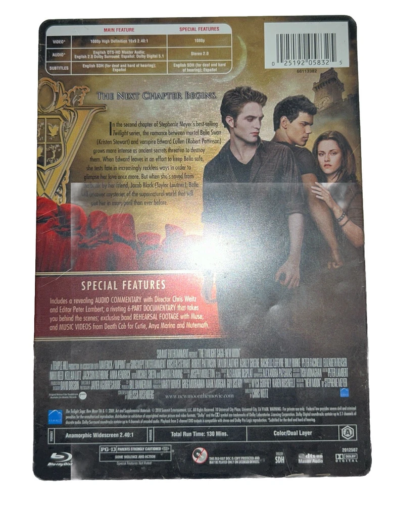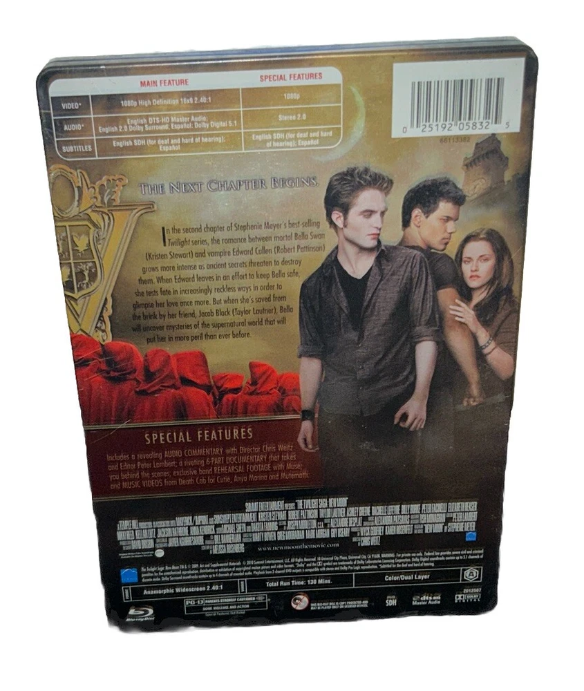 Immerse yourself in the world of vampires, werewolves, and humans with "The Twilight Saga: New Moon" on Blu-ray. This special edition steelbook features a 2.40:1 aspect ratio and a PG-13 rating, making it suitable for all ages. The movie, released in 2009, follows the story of Bella Swan, a human who falls in love with a vampire, and her struggles to save him. This Blu-ray edition includes a behind-the-scenes featurette, making-of documentaries, and more. The disc is region-locked to Blu-ray A (Americas, Southeast Asia...) and comes with a DVD edition year of 2010. Don't miss out on this action-fantasy drama, featuring Robert Taylor as a werewolf.