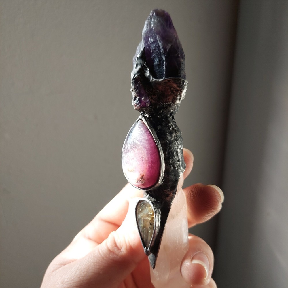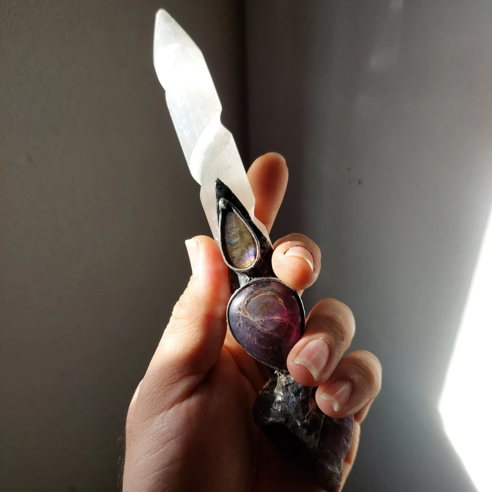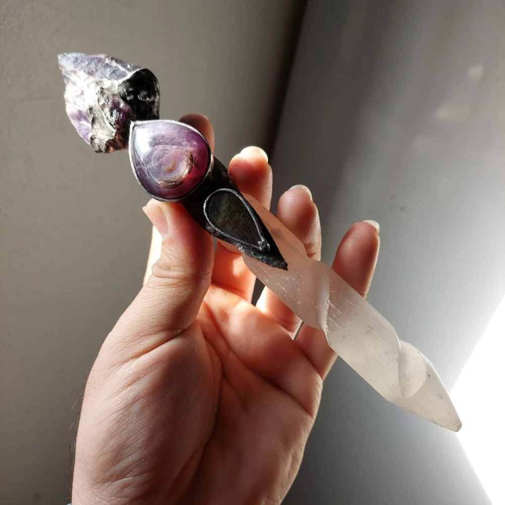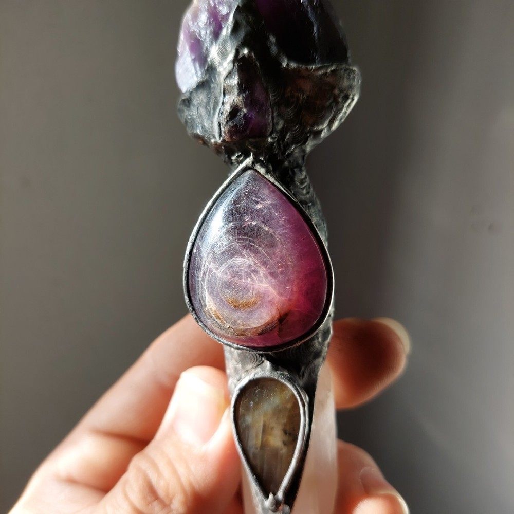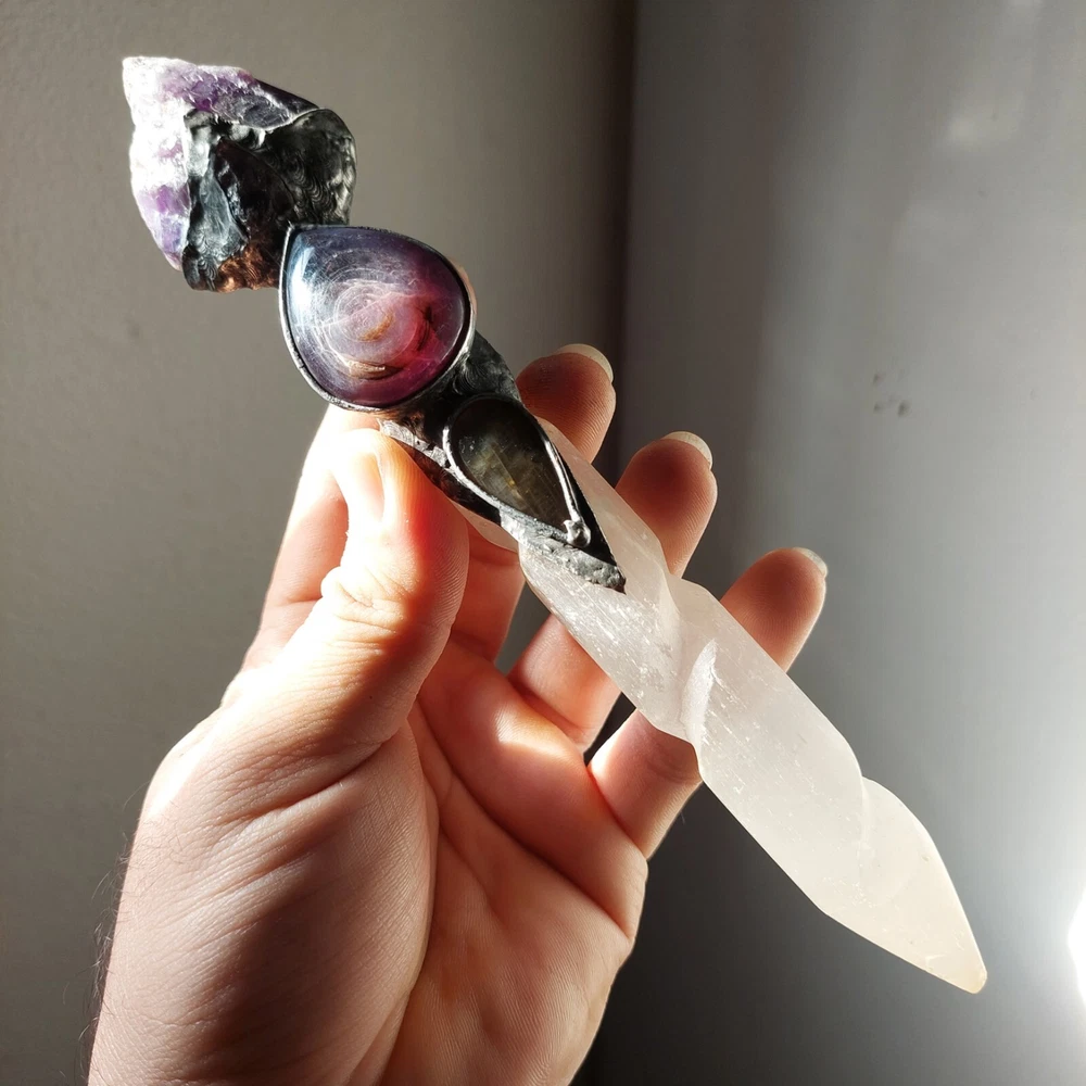 This is a gorgeous powerful healing purple wand for a high-priestess featuring, high-quality Gem Lepidolite, Purple Labradorite, dream amethyst on its crown on a satin spar(selenite) unicorn spiral horn, measures approximately 9-10". Jewelry is handcrafted with led free silver solder with a method called tiffany technique, using black patinas and a final polish to create an antique ancient magical feel to it. Wands are effective when working on the energetic and etheric levels of the body. The simplest way to work with wands on this level is to activate and balance the 7 chakra system. There is no physical contact with the body in this method so it is a great introduction for someone who is not used to energy work. Starting at the base chakra, spiral the wand in a clockwise motion to activate and balance this centre. Continue until you feel this chakra is balanced and move on to the next one until you have balanced all 7 chakras. This is a very simple yet effective way to use crystal wands to balance the body. Wands are also used to cast spells, create psychic shields, enhance or enchant jewelry and other objects. They may also be helpful in removing and destroying astral parasites, demons, and archons. You can deflect dark magic, curses or hexes and protect yourself from evil eye and evil witchcraft or evil entities, amongst many other useful magical deeds. Amethyst is a powerful and protective stone. It guards against psychic attack, transmuting the energy into love and protecting the wearer from all types of harm, including geopathic or electromagnetic stress and ill wishes from others. Amethyst is a natural tranquiliser, it relieves stress and strain, soothes irritability, balances mood swings, dispels anger, rage, fear and anxiety. Alleviates sadness and grief, and dissolves negativity. Amethyst activates spiritual awareness, opens intuition and enhances psychic abilities. Sometimes known as the lucky stone, satin spar brings good fortune to the bearer. It is a powerful calming stone that helps to clear confusion and brings clarity to the mind. It is extremely cleansing and never needs to be cleansed. A stone of transformation, Labradorite is a useful companion through change, imparting strength and perseverance. It balances and protects the aura, raises consciousness and grounds spiritual energies. Excellent for strengthening intuition - promoting psychic abilities. Powerful in revealing the truth behind illusions, Labradorite banishes fears and insecurities, and strengthens faith in the self and trust in the universe. It stimulates the imagination and calms an overactive mind, developing enthusiasm and new ideas. A “stone of transition”, Lepidolite assists in the release and reorganisation of old behavioural and psychological patterns, gently inducing change. It brings deep emotional healing, soothing and reducing stress and depression. Lepidolite dissipates negativity and insists on being used for the highest good. It activates the throat, heart, third eye chakras and the intellect. It opens the crown chakra, clearing blockages and bringing cosmic awareness. Lepidolite facilitates astral travel and accesses the Akashic Record. It helps to take you forward into the future, tuning you in to thoughts and feelings from other lives that are creating a blockage in your life now.